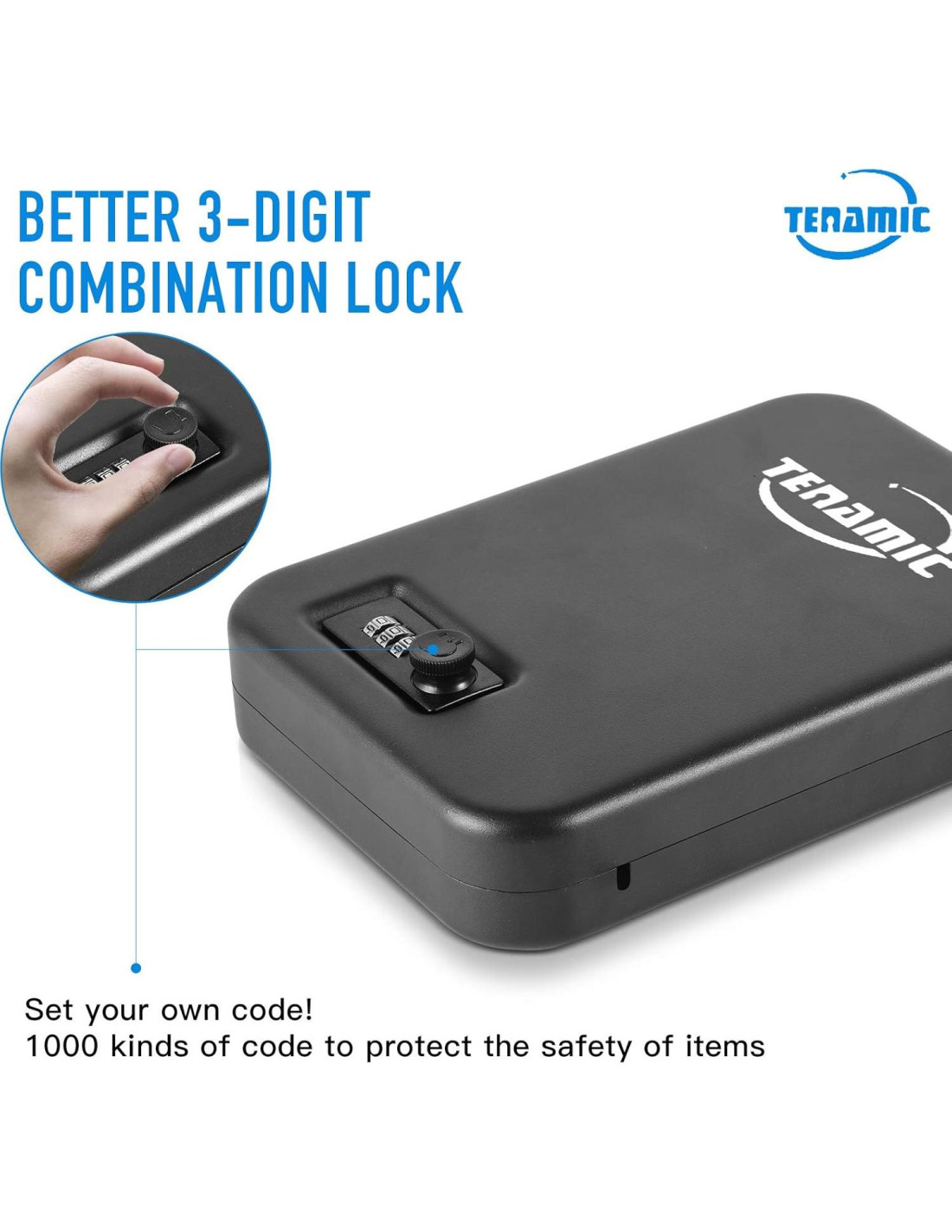 - [FÁCIL DE ALMACENAR] : La caja fuerte para pistolas TENAMIC puede almacenar fácilmente una pistola. También puedes guardar algunos objetos de valor, como efectivo, joyas o tarjetas bancarias para asegurar su seguridad. La caja fuerte para pistolas es muy adecuada para viajar, se puede colocar fácilmente en un cajón, armario o asientos de automóvil.