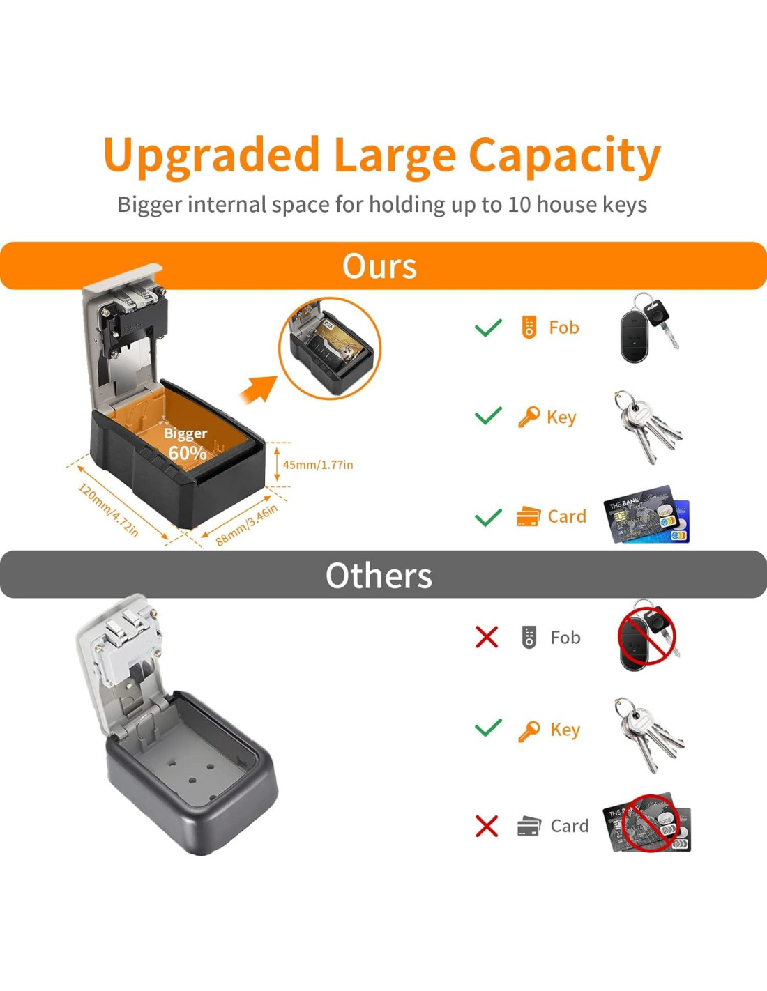 - TAMAÑO PLUS, CAPACIDAD MEJORADA PARA LA MAYORÍA DE LAS LLAVES DE COCHE: La caja de seguridad portátil para llaves proporciona un gran espacio interno para sostener hasta 10 llaves de casa [más cortas que 3.35 pulgadas]; Cuando viajas o estás fuera por negocios, puedes poner tus llaves de casa, llaves de coche, llaves de control remoto, tarjetas de crédito y unidades USB;