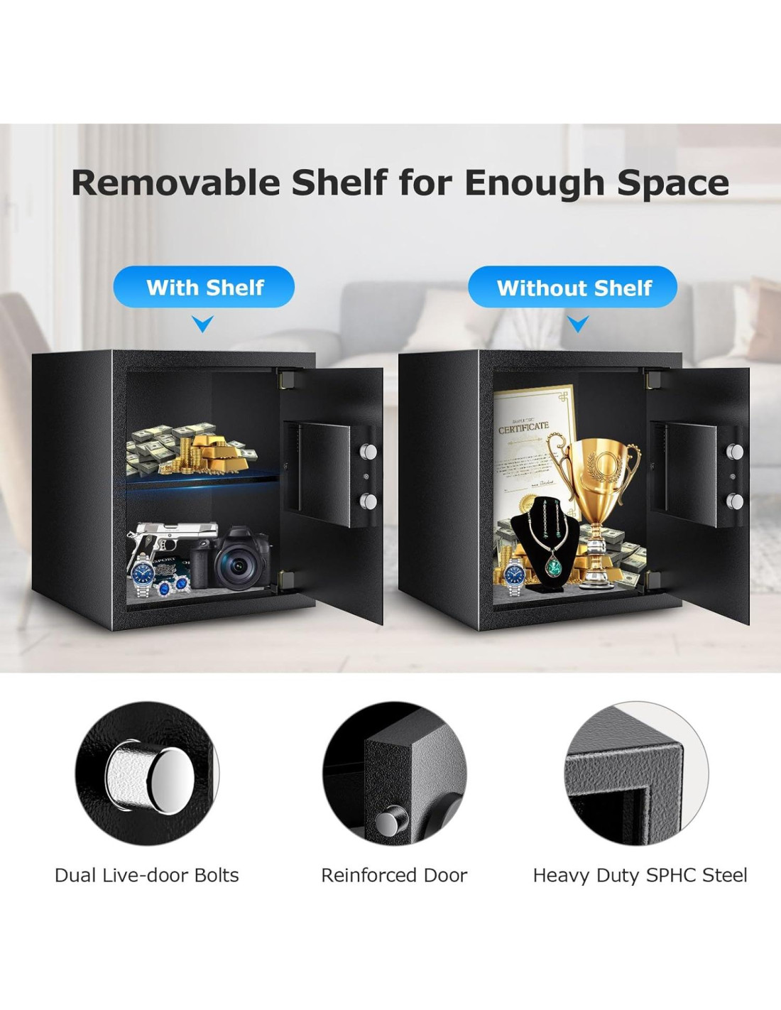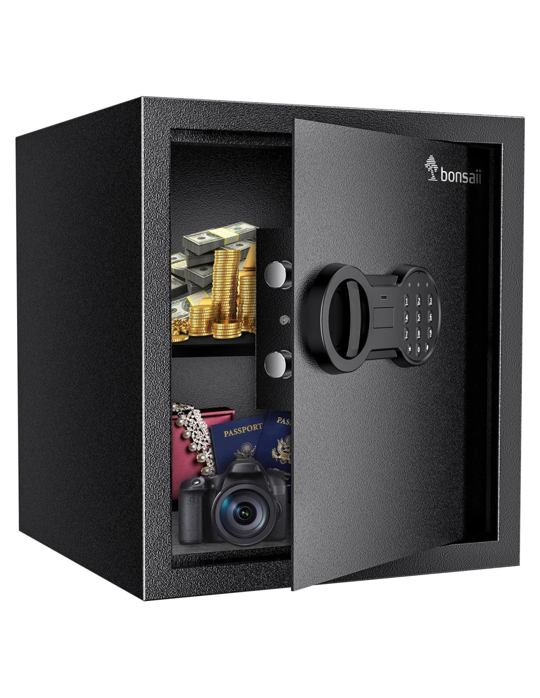 - Capacidad de 1.2 Pies Cúbicos: Exterior: 32.9 x 32.9 x 35.9 cm (D x W x H); Interior: 32.7 x 32.7 x 35.7 cm (D x W x H); La caja fuerte grande Bonsaii con estante extraíble crea un lugar seguro para documentos, joyas, efectivo y medicamentos.
