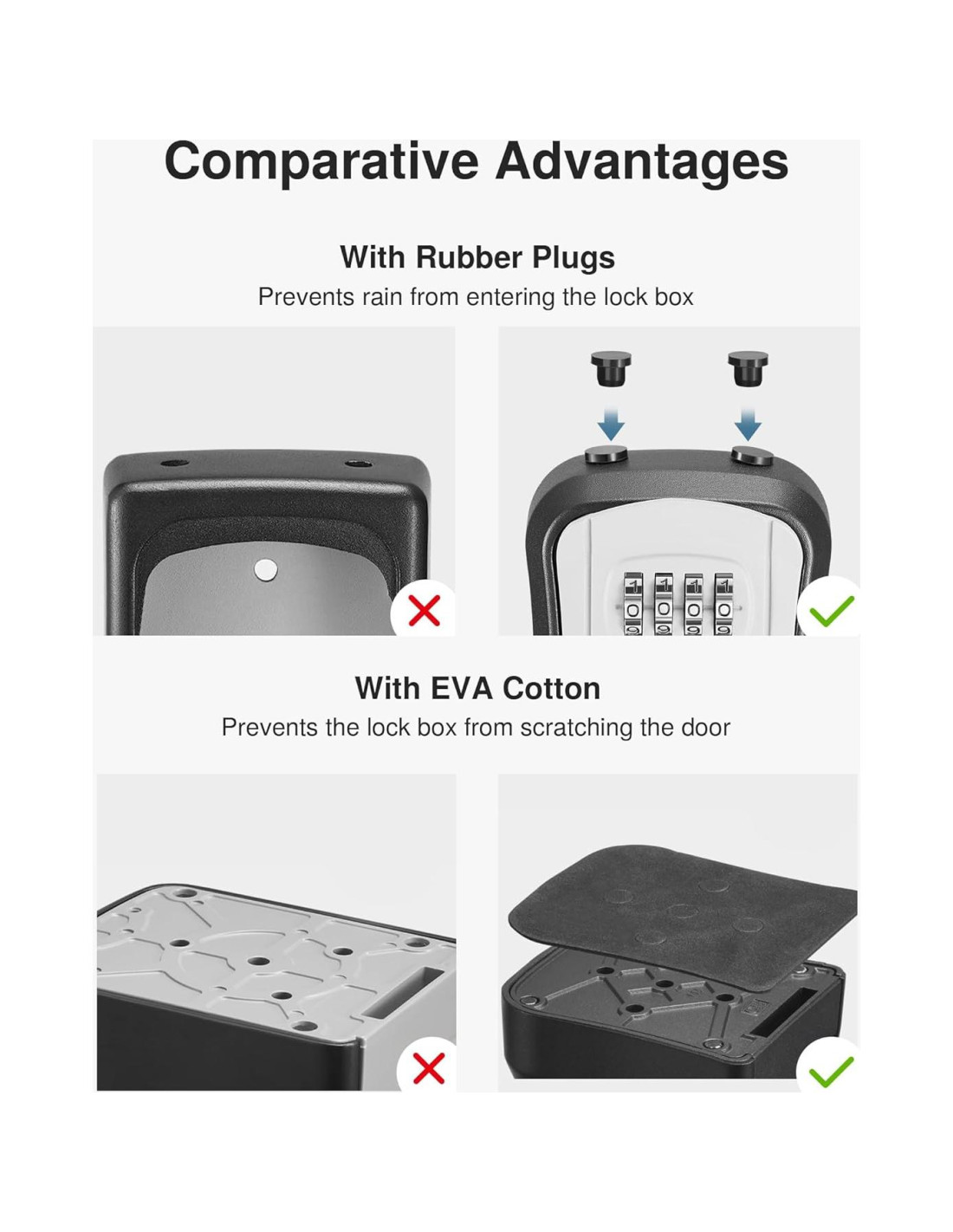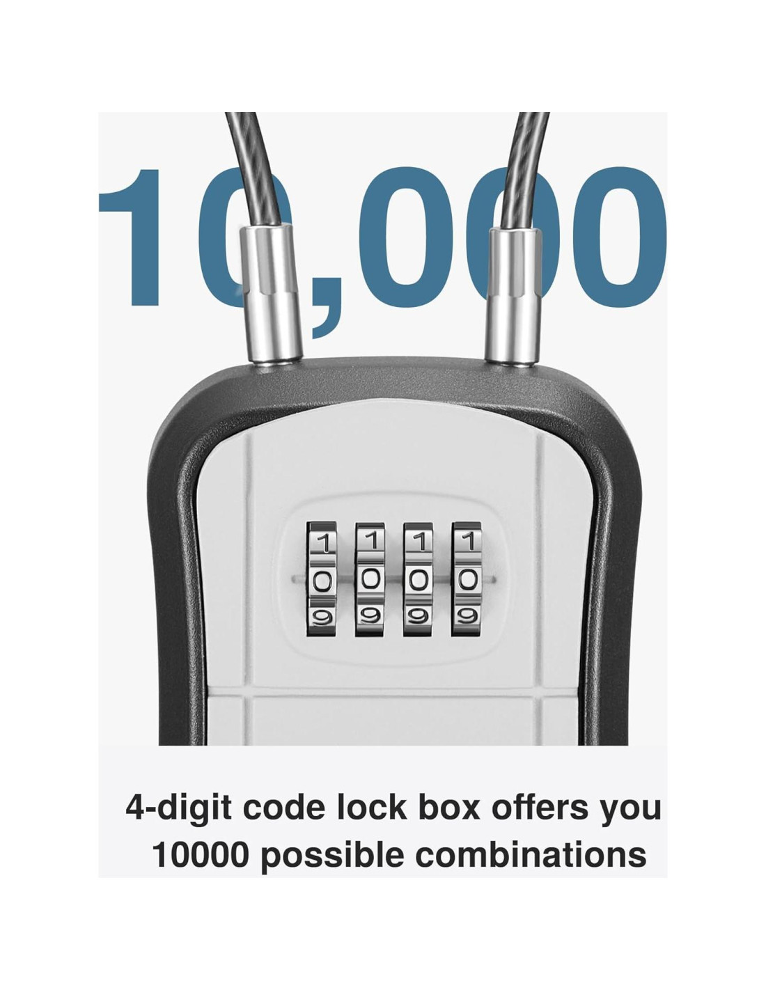 - Cerradura de Combinación Segura: El código reajustable de 4 dígitos de la caja de llaves proporciona protección adicional con 10,000 combinaciones posibles para asegurar la seguridad de tus llaves. El código es simple de reajustar y no es fácil de romper.