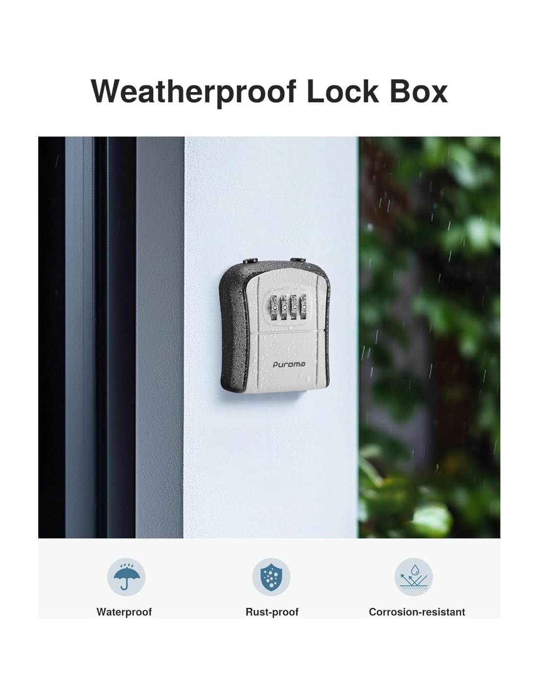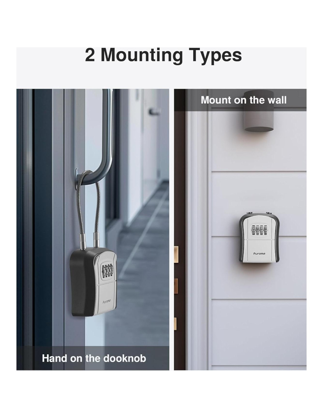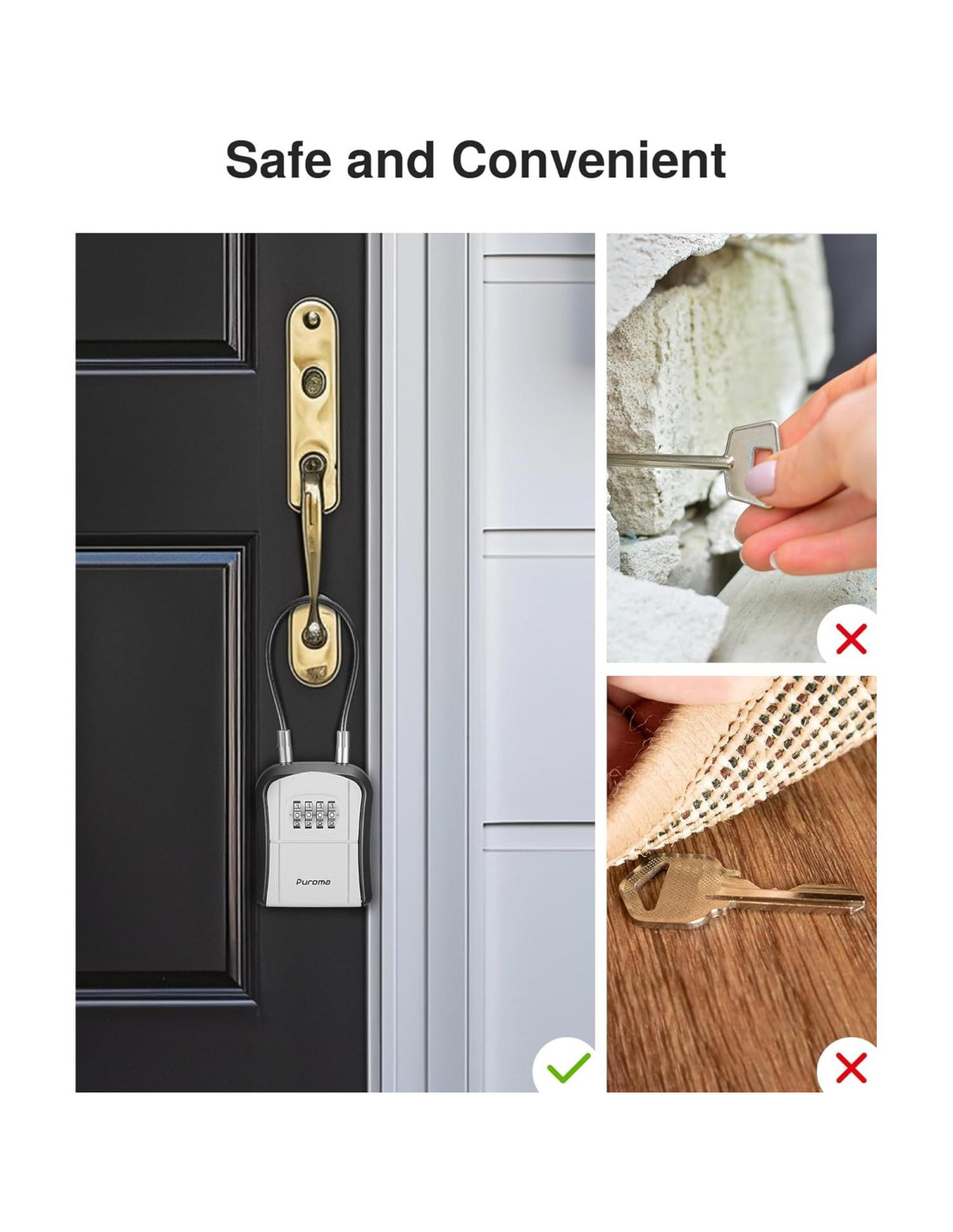 tu compañero en protección. Nuestro compromiso con la mejora de tu seguridad se hace realidad a través de una variedad de soluciones impactantes: candados de combinación, candados de llave, candados TSA, cajas de seguridad portátiles y más. Dondequiera que la vida te lleve, confía en Puroma para mantener tu hogar, pertenencias y viajes seguros. Puroma, Protectores de lo que Amas. Su facilidad de uso lo convierte en una forma confiable y conveniente de almacenar llaves de repuesto mientras asegura un acceso fácil cuando sea necesario. Puedes usarlo para almacenar llaves de repuesto para tu hogar, oficina, almacén o apartamento. Diseñada con un mango removible, esta caja de llaves es portátil y se puede colgar de manera conveniente y segura en un pomo de puerta o cerca, perfecta para entrada de emergencia cuando estás de viaje de negocios o vacaciones. La carcasa de metal está hecha de materiales de alta calidad, a prueba de óxido, resistente a la corrosión, a prueba de clima y duradera. Con 10,000 combinaciones posibles, no tendrás que preocuparte por extraños encontrando tu llave y accediendo a tu casa. Este robusto mango está construido de acero premium que ofrece una dureza y durabilidad excepcionales, evitando que el vástago de la cerradura sea cortado. Cuerpo de cerradura duradero hecho de aleación de aluminio resistente, asegurando que pueda soportar golpes, sierras y palancas. Caja de Llaves