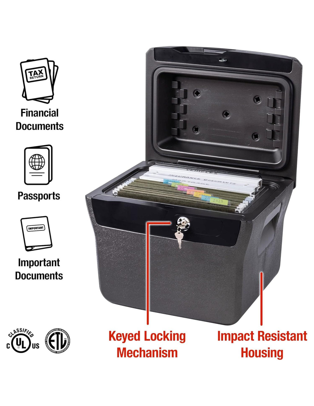- ALMACENAMIENTO DE DOCUMENTOS: La caja a prueba de fuego acomoda archivos colgantes de tamaño carta y carpetas (se venden por separado) para un fácil almacenamiento de pasaportes, tarjetas de seguro social y certificados de nacimiento