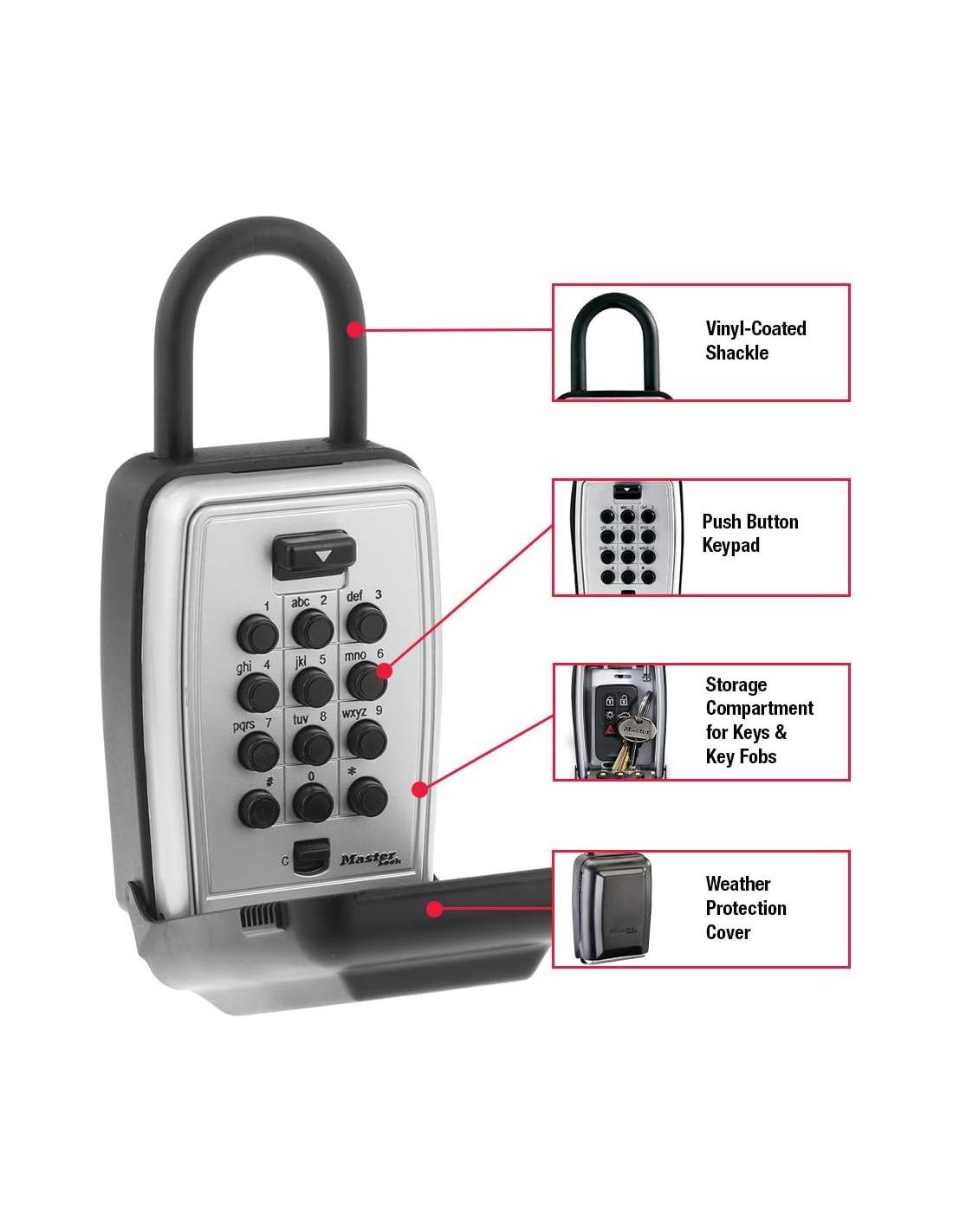 - Para uso en interiores y exteriores; la caja de llave está construida con un cuerpo de metal para durabilidad, grillete recubierto de vinilo para prevenir rayones y cubierta contra el clima para proteger los botones de combinación