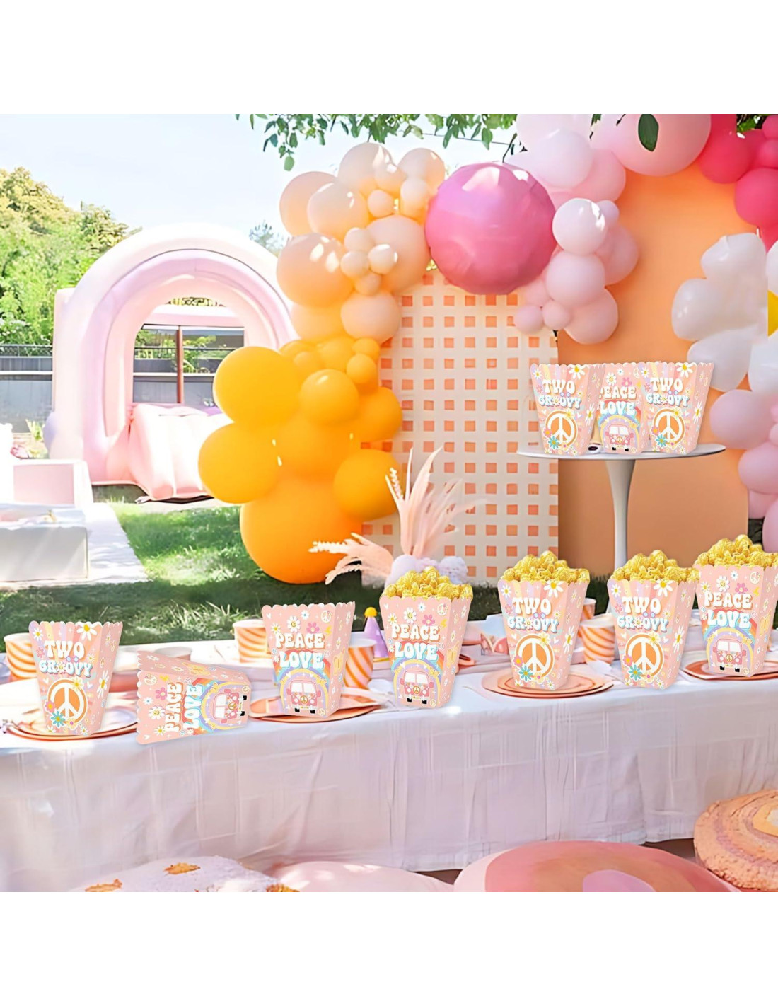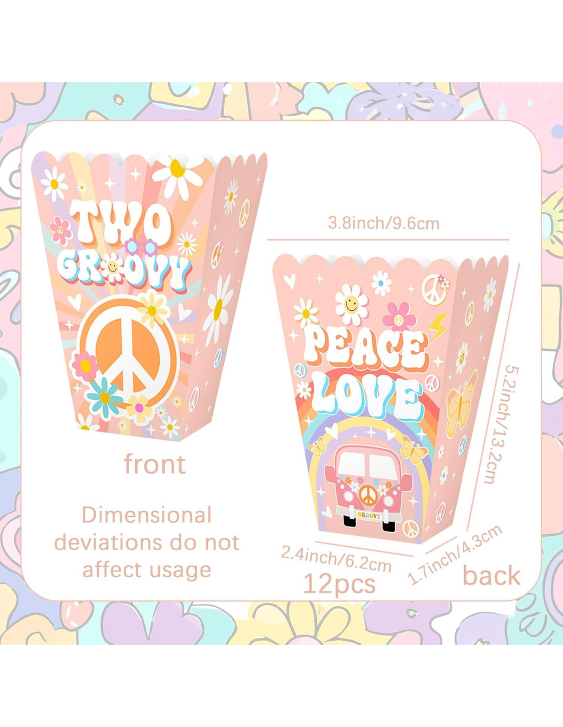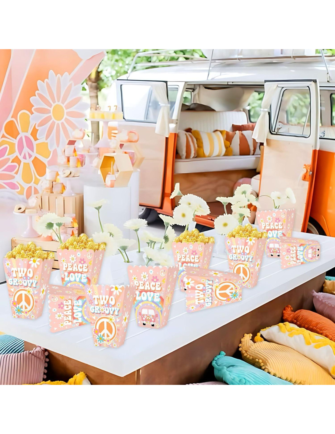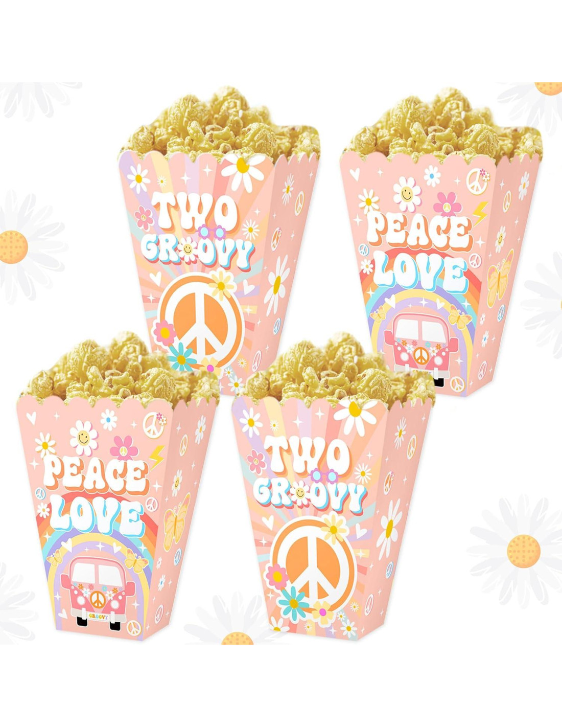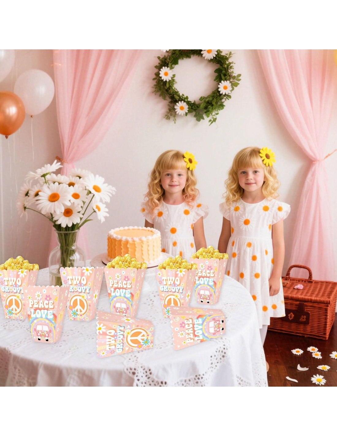 - Cajas de Favor de Fiesta con Tema Groovy: Estas cajas de palomitas de maíz impresas con margaritas retro añaden un ambiente divertido e inspirado en los hippies a fiestas temáticas de los 70, celebraciones de cumpleaños o eventos de poder floral. ¡Genial para niños, adolescentes y adultos!