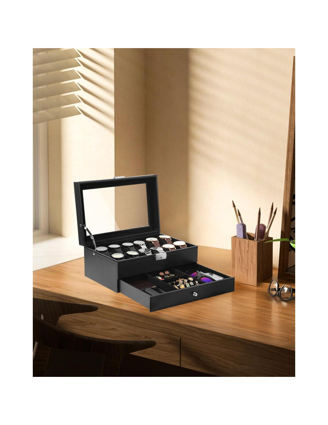 - 2 Capas, Almacenamiento Clasificado: Puedes exhibir tus relojes en la estantería superior de la caja de relojes y organizar tus correas, pulseras y anillos en el cajón inferior. Almacenamiento compartimentado para mayor orden.