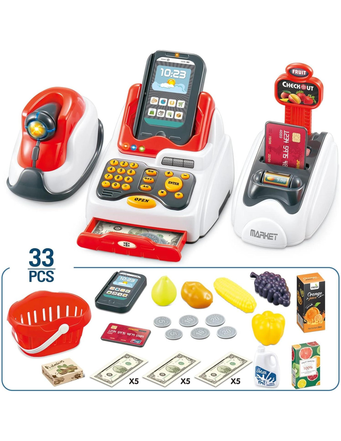- Con 33pcs de accesorios como monedas falsas, dinero de juguete para niños, tarjetas de crédito, cesta de compras y algunos juguetes de comida. Satisface todas las necesidades de juego.