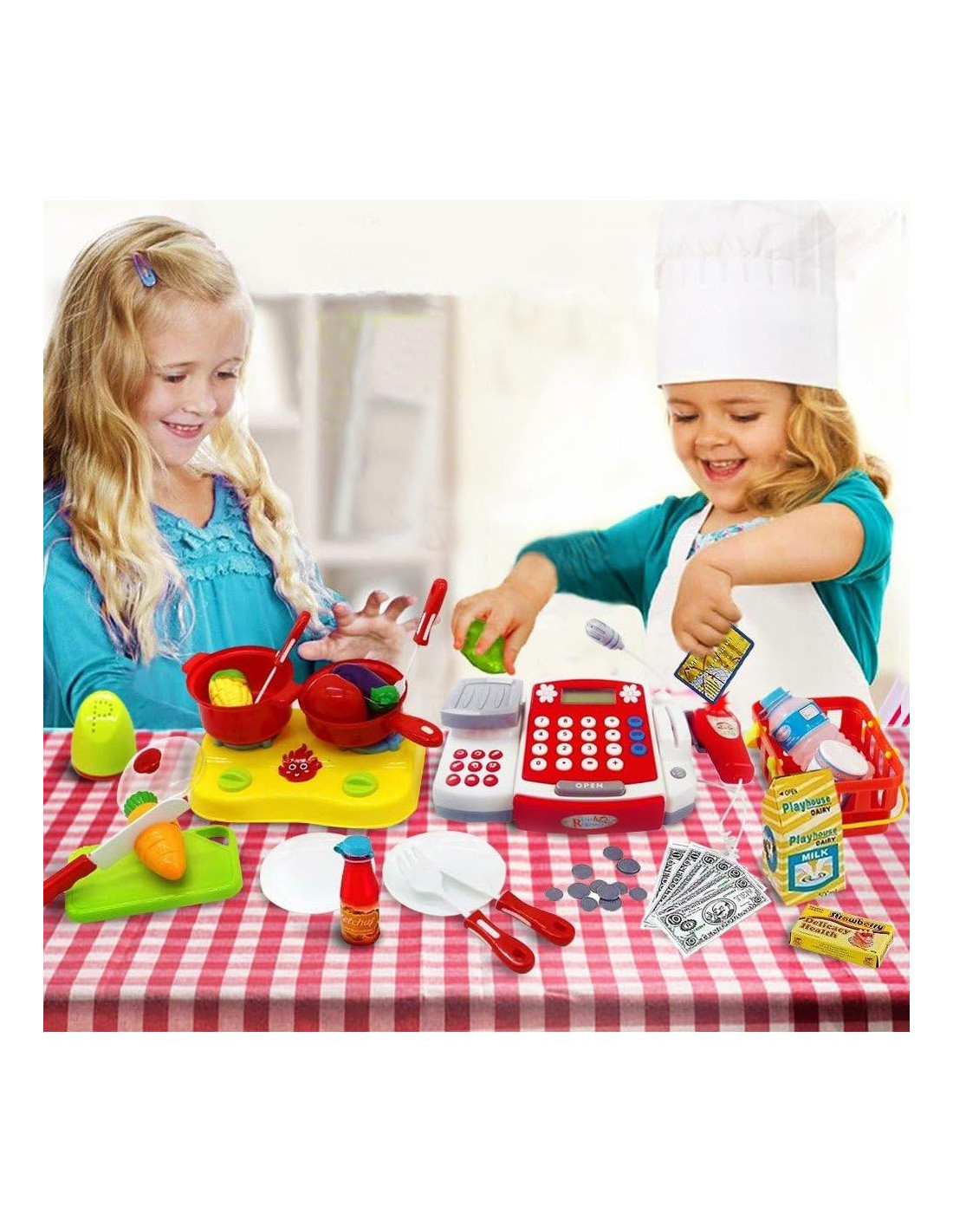 - UN JUEGO COMPLETO DE JUEGO DE FINGIR - Incluye una caja registradora de juguete para niños con escáner, dinero de juguete, tarjetas de crédito, una mini cesta de compras, juego de comida de supermercado con un dulce mini juego de utensilios.