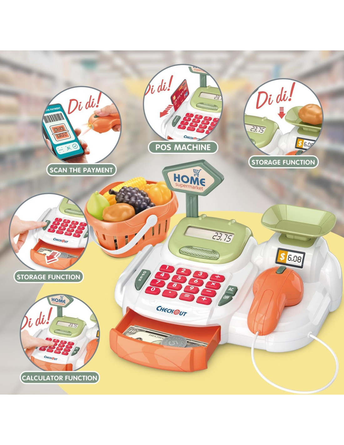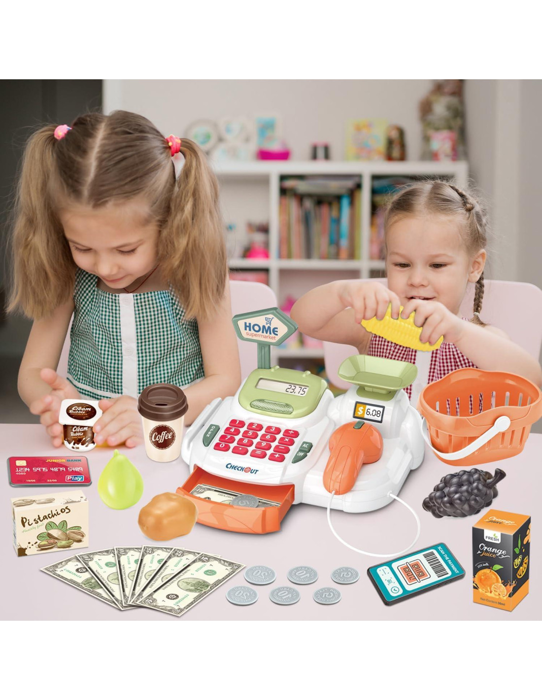- [Conjunto Completo de Caja Registradora] Incluye una caja registradora de juguete con cajón, un escáner de juguete, una cesta de compras, un conjunto de comida de juguete y más. Los niños pueden disfrutar de un divertido viaje simulado al supermercado.