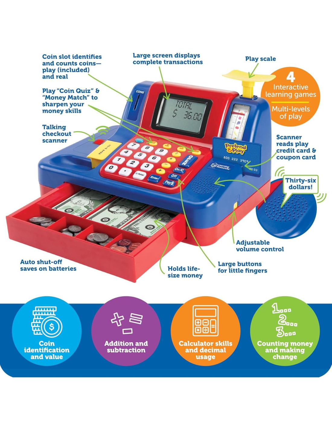 - APRENDIZAJE INTERACTIVO - Involucra a los niños con una caja registradora hablante que enseña habilidades de dinero, reconocimiento de monedas y matemáticas básicas a través de juegos divertidos incorporados
