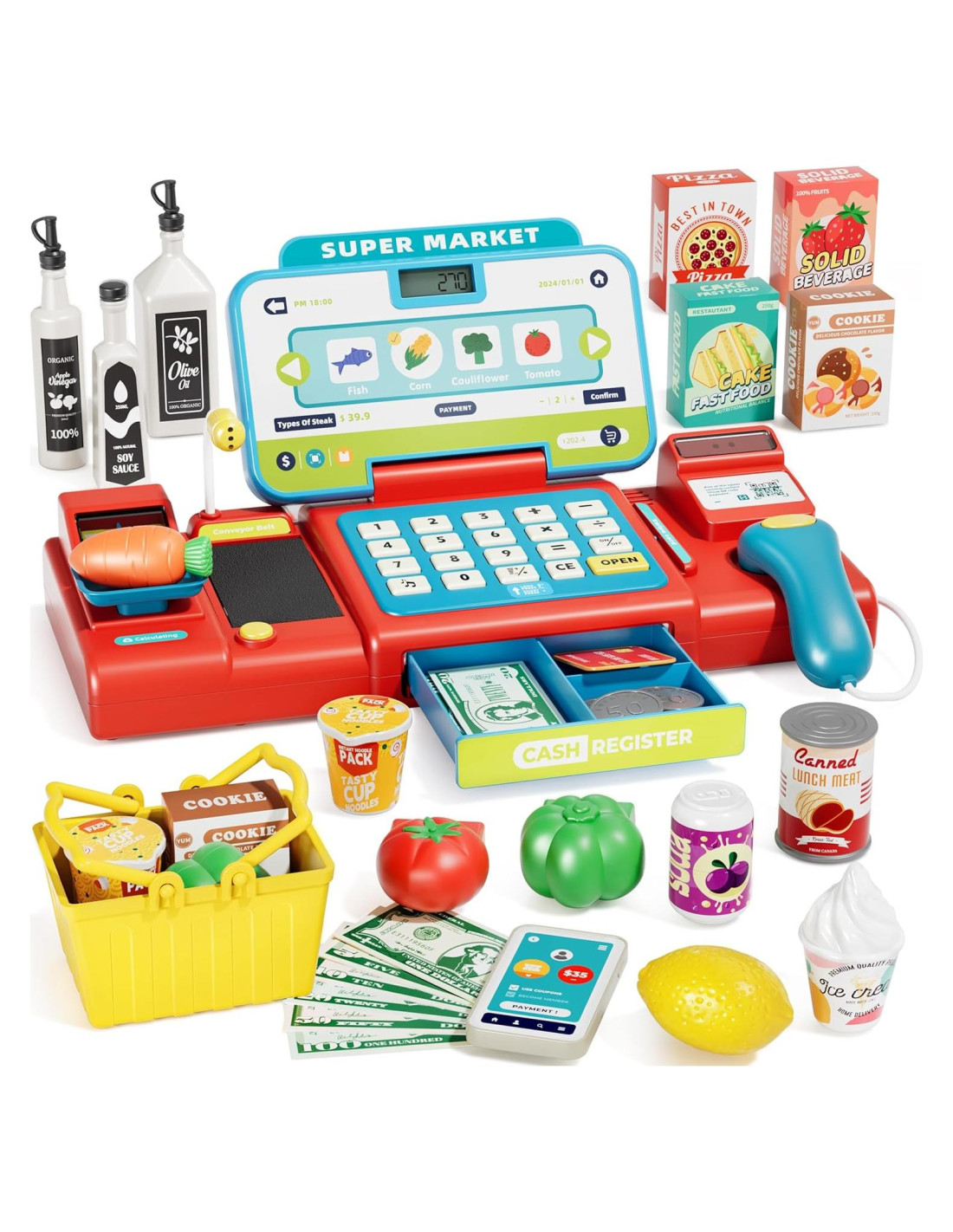 - [Escáner Interactivo Mejorado] Cuando los niños escanean los artículos de los comestibles, nuestra caja registradora lee los nombres y precios de los productos. Esto mejora el vocabulario, el reconocimiento de números y añade un giro educativo atractivo al tiempo de juego.