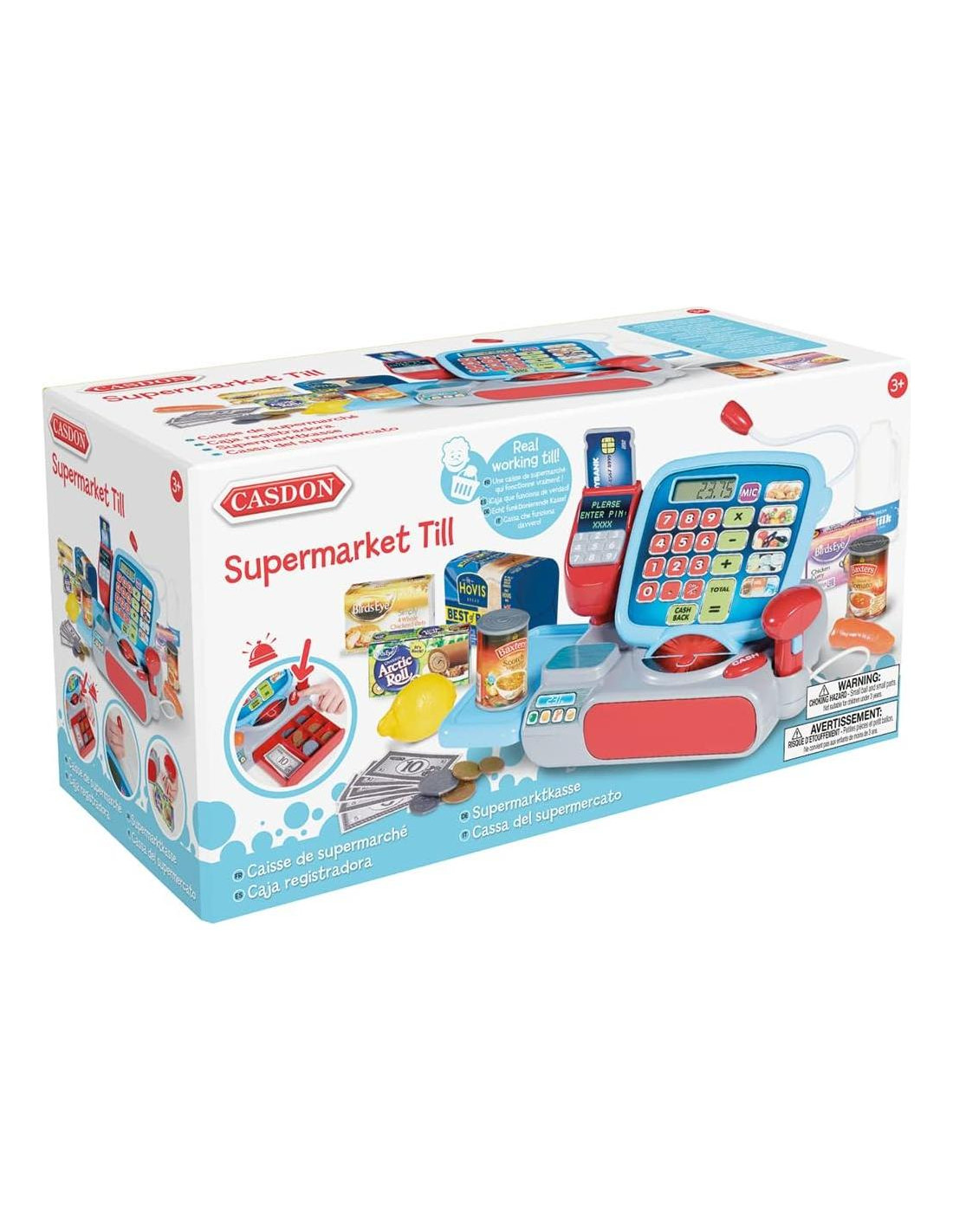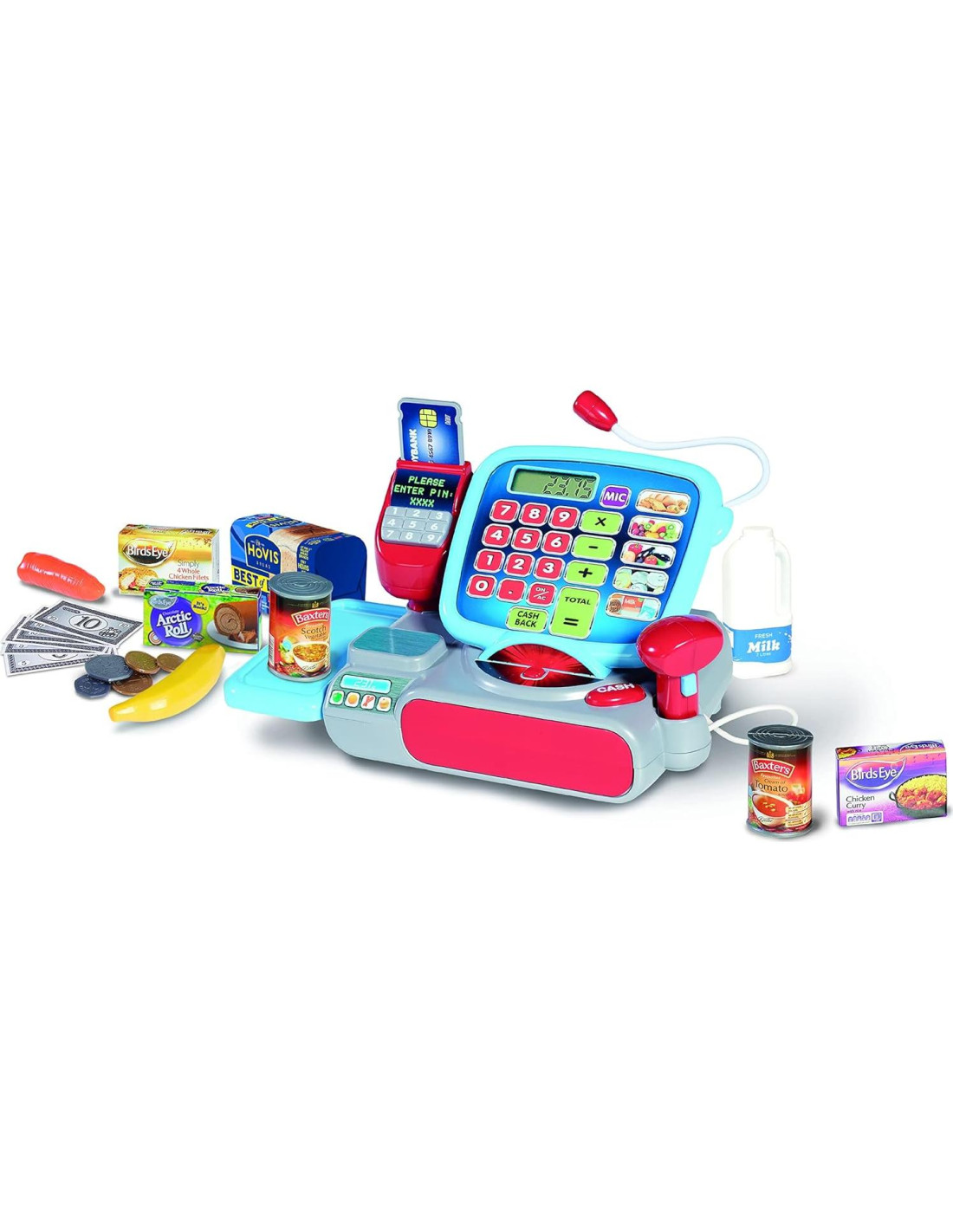 - INCLUYE: Caja registradora de supermercado de juguete con caja registradora, calculadora funcional, micrófono, escáner, función de chip y pin, tarjetas de débito de juego, dinero de juego y una selección de comida de mentira