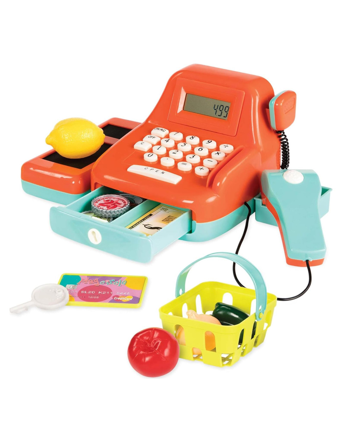 - Set de Compras Completo - Este set de caja registradora para niños incluye 26 piezas: dinero de juguete, monedas, tarjeta de crédito, verduras de juguete y cesta de compras - todo lo necesario para infinitas aventuras de compras