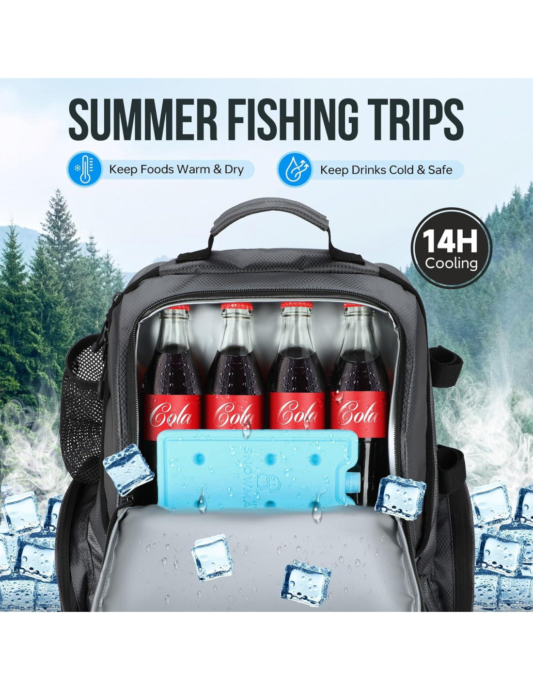 - Mochila de Pesca con Enfriador: Esta bolsa de aparejos de pesca cuenta con un compartimento enfriador incorporado. Incluso en el calor del verano, el compartimento enfriador asegura que tus bebidas se mantengan refrescantemente frías. Para un rendimiento óptimo, simplemente agrega paquetes de hielo para mejorar el efecto de enfriamiento. La capa aislante no solo mantiene la temperatura ideal, sino que también garantiza que tu comida permanezca limpia y segura, incluso en los entornos exteriores más desafiantes