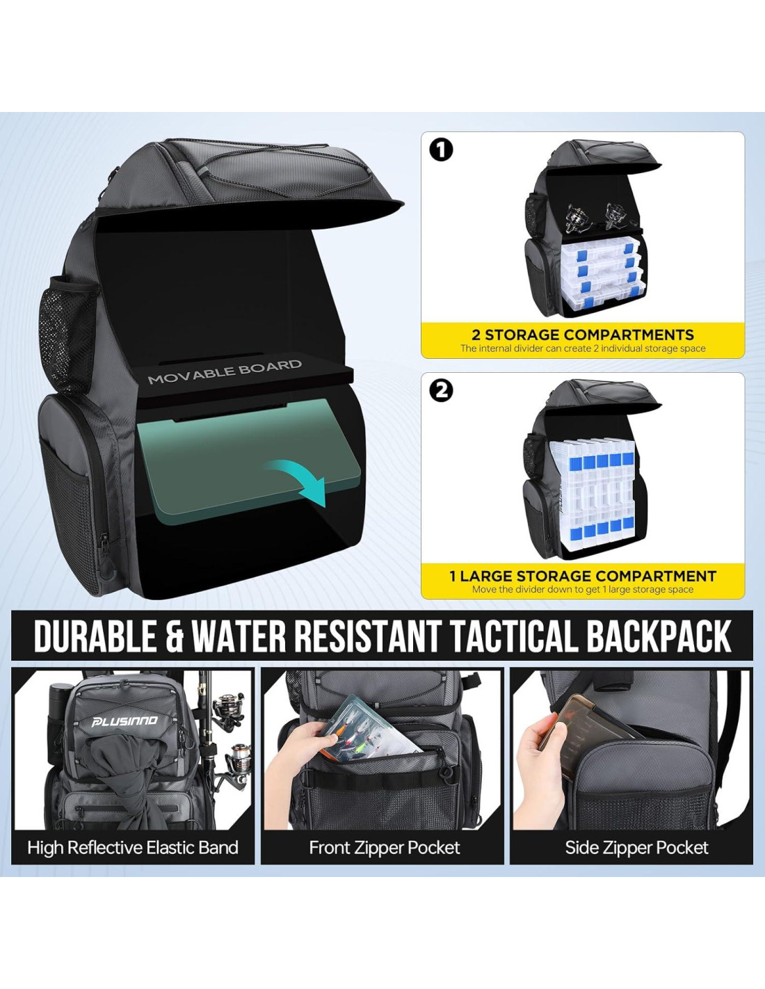 - Resistente al Agua y Robusta - La mochila de pesca PLUSINNO con 4 cajas de aparejos está fabricada con tela de poliéster de alta densidad 900D, asegurando un rendimiento superior a largo plazo. La tela resistente es resistente a desgarros y abrasiones, asegurando que la mochila soporte ramas en la naturaleza. Incluso en lluvia repentina, la mochila de pesca mantiene tu equipo de pesca u otros artículos secos. La exquisita artesanía y la firme costura garantizan una durabilidad prolongada, convirtiéndola en una parte esencial de tu viaje de pesca