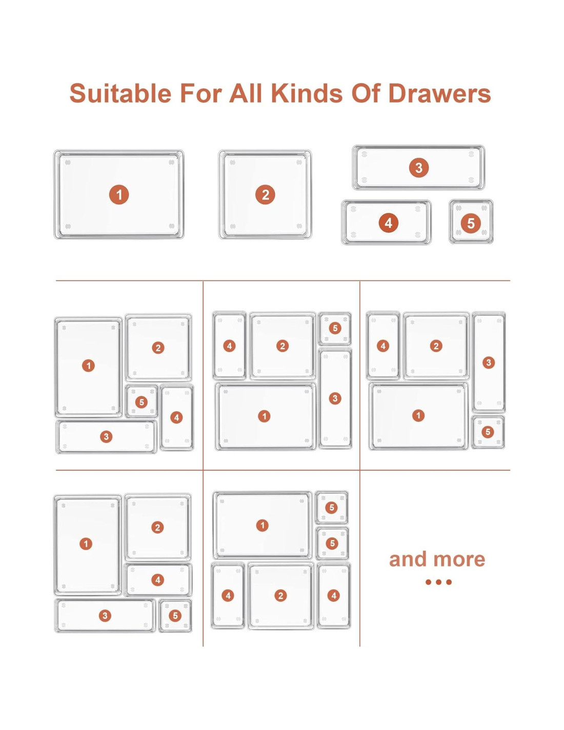 - Múltiples Tamaños - 5 tamaños diferentes y 13 bandejas ofrecen combinaciones personalizadas para almacenar cosas y organizar el cajón según sus necesidades específicas. Tamaño: 22.6 x 15 x 4.8 cm (2 paquetes), 22.6 x 7.6 x 4.8 cm (3 paquetes), 15 x 15 x 4.8 cm (1 paquete), 15 x 7.6 x 4.8 cm (4 paquetes), 7.6 x 7.6 x 4.8 cm (3 paquetes).