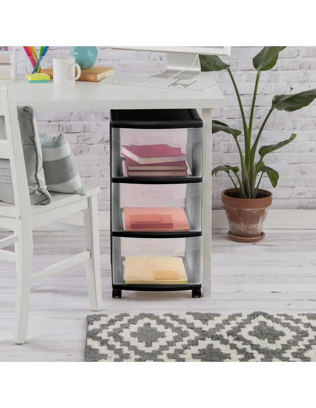 Torre Ancha de Cajones de Plástico Carro de Almacenamiento de Plástico con Cajones Transparentes Extraíbles, Negro