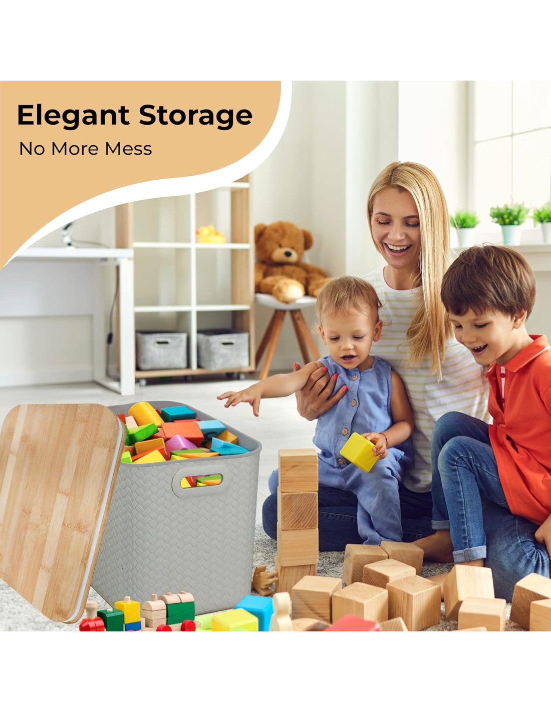 - Tapa de Bambú Ecológica para un Toque Sostenible - Cada caja incluye una tapa de bambú natural y sostenible que ayuda a ocultar el desorden mientras mantiene el contenido libre de polvo. La tapa no solo es resistente y ecológica, sino que también realza la estética limpia y orgánica de su espacio de almacenamiento.