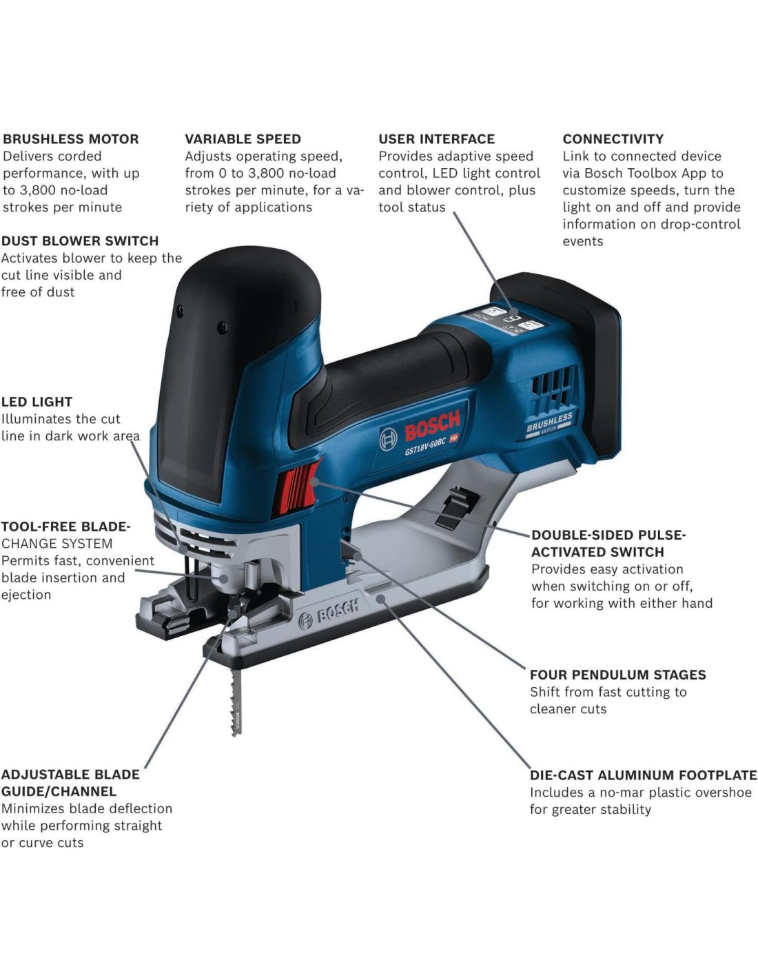 Esta sierra de calar inalámbrica de 18V está optimizada para cortes curvos, incluso a través de materiales más gruesos. La sierra de calar de agarre de barril Bosch GST18V-60BC presenta un motor sin escobillas que ofrece un rendimiento similar al de una herramienta con cable, con una velocidad de 0 a 3,800 golpes por minuto. Esta sierra de calar de agarre de barril proporciona un interruptor de doble cara activado por pulso de fácil acceso para trabajar con la mano izquierda o derecha. Cuenta con una guía/canal de hoja ajustable, que minimiza la deflexión de la hoja al realizar cortes rectos o curvos. La sierra de calar tiene cuatro etapas de péndulo, para cambiar de cortes rápidos a cortes más limpios. Conectarse a la sierra de calar permite al usuario preseleccionar velocidades, encender y apagar la luz, y proporcionar información sobre eventos de control de caída a través de la aplicación Bosch Toolbox. Esta sierra de calar cuenta con un ajuste de control de velocidad adaptativo, que reducirá los golpes por minuto para controlar el punto de entrada de la hoja y la pieza de trabajo. Una vez que la hoja de sierra toca la pieza de trabajo, la sierra de calar reanudará la velocidad seleccionada, para proporcionar el mejor control y precisión. Esta sierra de calar también cuenta con un soplador que se puede encender y apagar. La sierra de calar es compatible con riel guía y adaptador de círculo. La sierra de calar tiene áreas de agarre suave extendidas en la parte delantera y una circunferencia de agarre de barril pequeña para un mayor control de la herramienta. Las líneas de corte permanecen visibles gracias al soplador de polvo y la luz LED. La sierra de calar cuenta con un sistema de cambio de hoja T sin herramientas. La gran base de aluminio fundido a presión con una sobrecubierta de plástico sin marcas ayuda a prevenir daños en la pieza de trabajo.