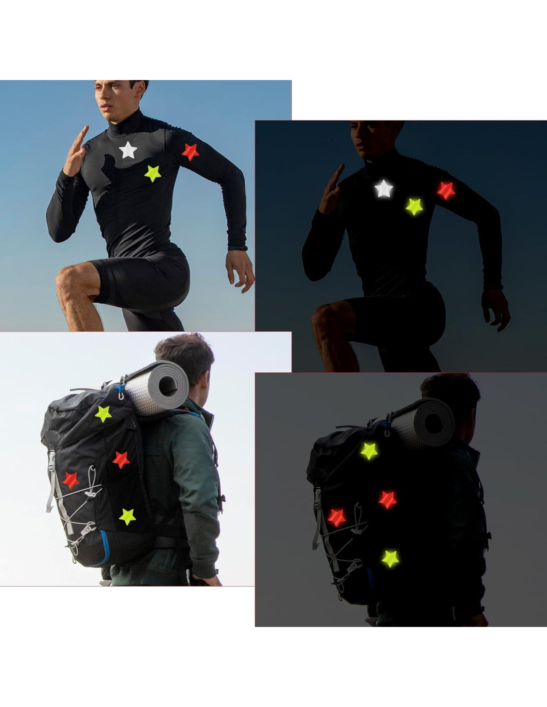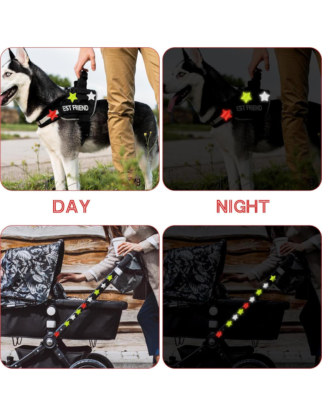 - Contenido del paquete: hay 30 piezas de cinta reflectante de visibilidad en 3 colores: rojo, amarillo, blanco. Cada cinta reflectante impermeable para exteriores mide aproximadamente 2.4 pulgadas (6 cm), el diseño en forma de estrella hace que los puntos reflectantes se vean muy lindos y llamativos.