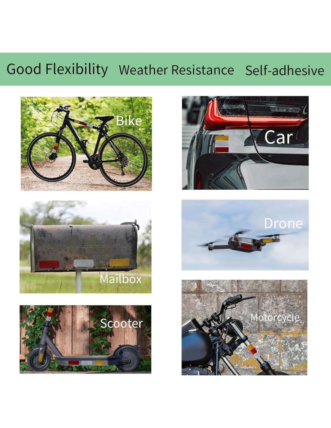 - BUENA ADHESIÓN: Las calcomanías reflectantes utilizan adhesivo sensible a la presión, que tiene un amplio rango de aplicabilidad y puede ser utilizado en varias superficies. Después de pegar, se adhiere firmemente sin bordes enrollados. Adecuado para uso en superficies planas y curvas.