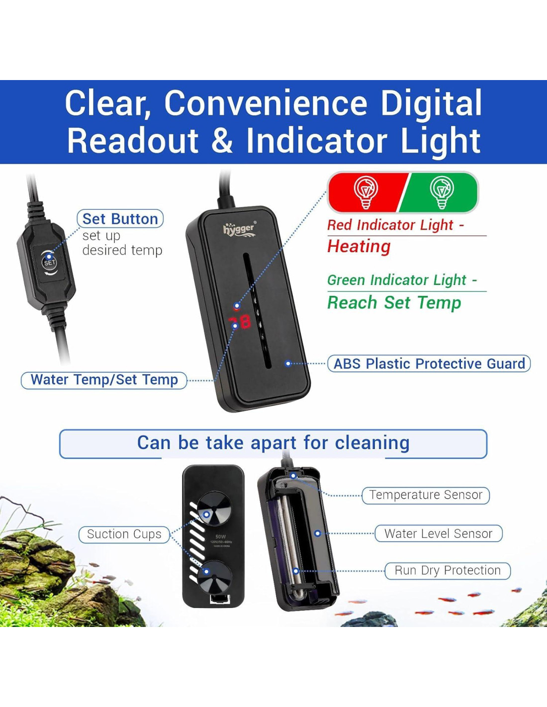 - Construcción Segura y Robusta -- Tubo de cuarzo irrompible incorporado envuelto con dos placas de mica de elemento calefactor y alambre de níquel, junto con una carcasa de plástico de alto impacto, el calentador de tanque de peces hygger asegura la seguridad de tus mascotas mientras mantiene una temperatura adecuada y constante.