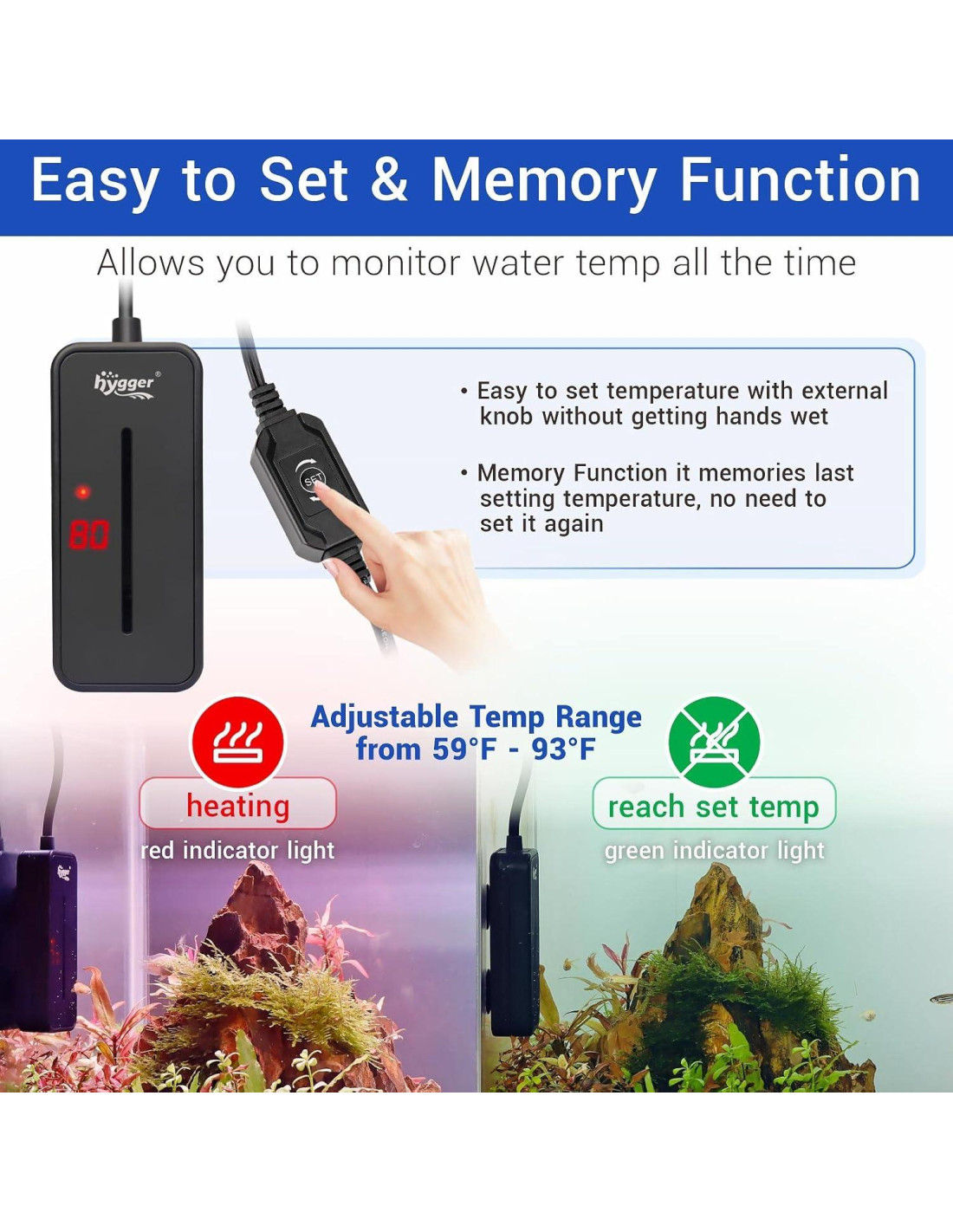 - Temperatura Ajustable y Función de Memoria -- El calentador para peces betta con control externo te permite ajustar rápidamente la temperatura sin mojarte las manos, especialmente en invierno, con un rango de temperatura ajustable de 15C a 34C en incrementos de 1 grado. Función de memoria que recuerda la última configuración, por lo que no tienes que restablecer la temperatura después de un corte de energía.