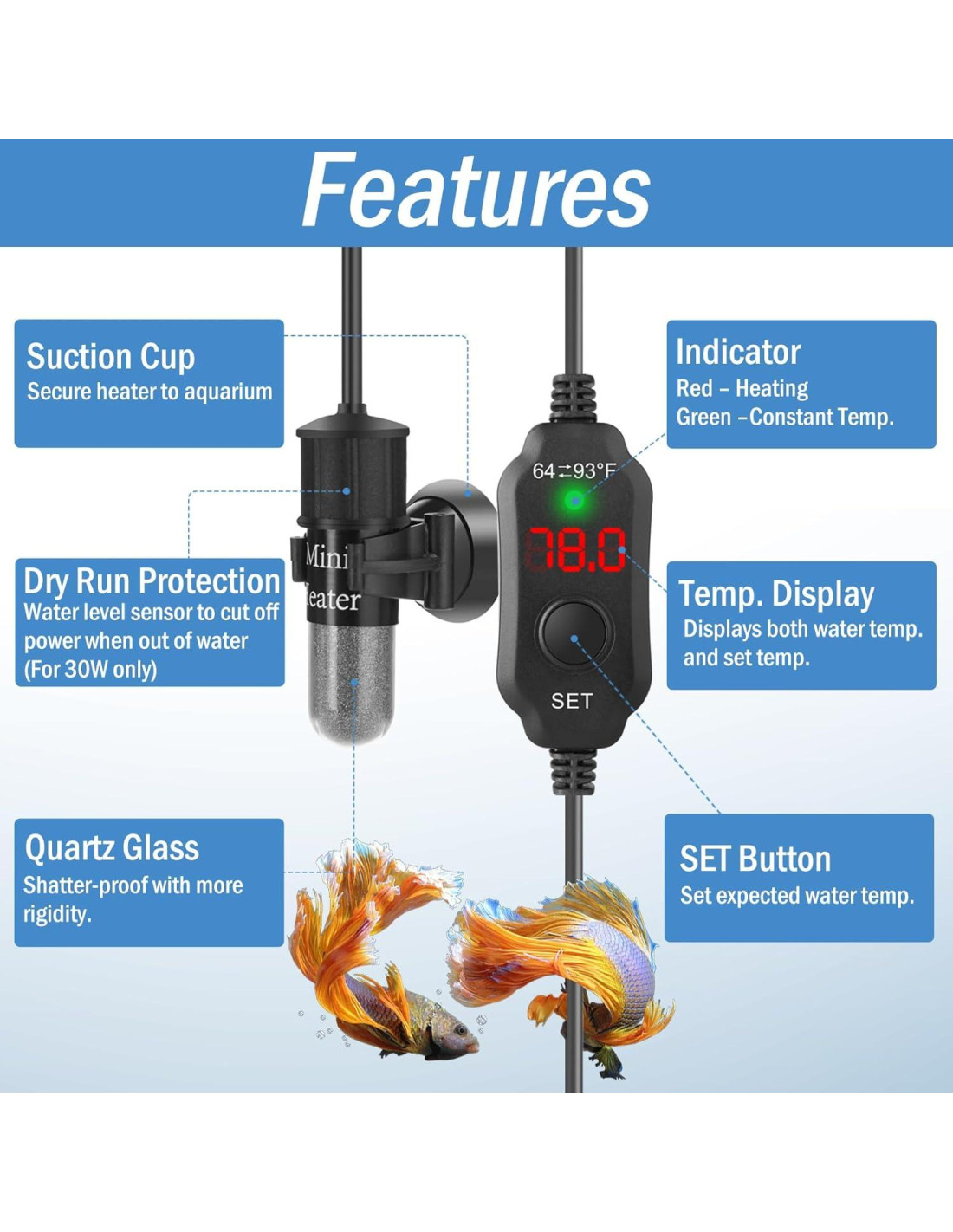 - PROTECCIÓN CONTRA FUNCIONAMIENTO EN SECO / SOBRECALENTAMIENTO - La seguridad es una prioridad. Este calentador de tanque de peces mini incorpora múltiples protecciones. Se apaga automáticamente cuando el nivel de agua cae por debajo del requisito mínimo o cuando la temperatura del agua supera los 36C. Puedes estar seguro de que tus peces estarán a salvo del sobrecalentamiento.