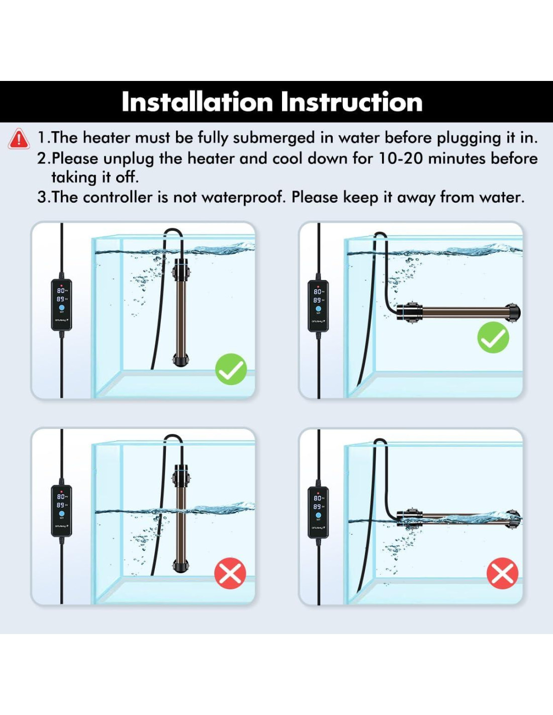 - Calentamiento Rápido del Agua y Sensor de Agua Preciso: Con un alambre de níquel-cromo premium enrollado uniformemente, el calor puede disiparse rápidamente a un área más amplia en el agua, calentando el agua de manera más eficiente. Un sistema único de detección de temperatura del agua puede corregir con precisión la temperatura del agua en tiempo real al valor establecido, protegiendo a sus vidas acuáticas de fluctuaciones en la temperatura del agua. Una vez que la temperatura del agua supera los 95F (35C), el calentador cortará automáticamente la energía y se mostrará el código de error EE, liberando a sus peces del riesgo de 'peces hirviendo'.