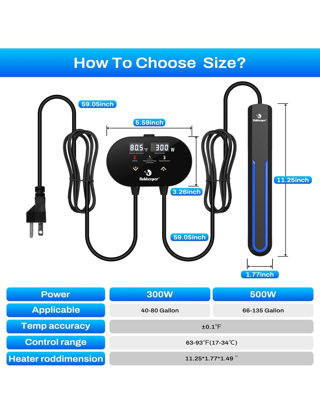 - Regulación de temperatura precisa y visible: los ajustes de temperatura se pueden ajustar y mostrar fácilmente en la pantalla LED, lo que lo hace tanto inteligente como fácil de usar. El rango de temperatura ajustable es de 63F (17C) a 93F (34C), con incrementos de 0.5F (0.28C). El calentador de tanque de 300W es adecuado para acuarios que van de 40-80 galones (151-303 litros), y funciona bien tanto en ambientes de agua dulce como salada. El calentador de betta para acuarios también tiene una función de memoria de falla de energía, restaurando automáticamente la configuración anterior después de un corte de energía, eliminando la necesidad de reconfiguración.
