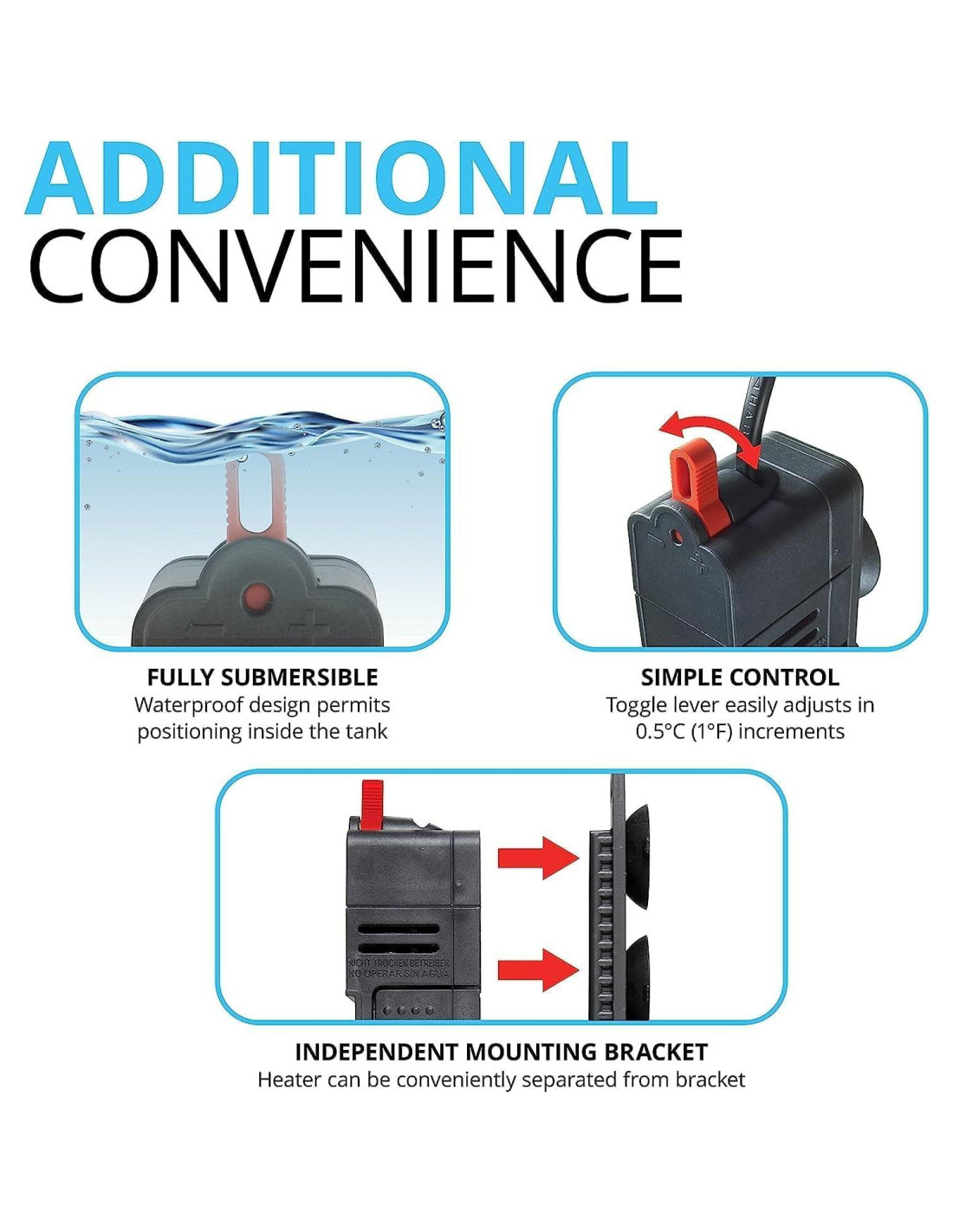 - Tecnología de calentamiento rápido construida con un apagado de seguridad y guardia de peces integrado para proteger peces e invertebrados
