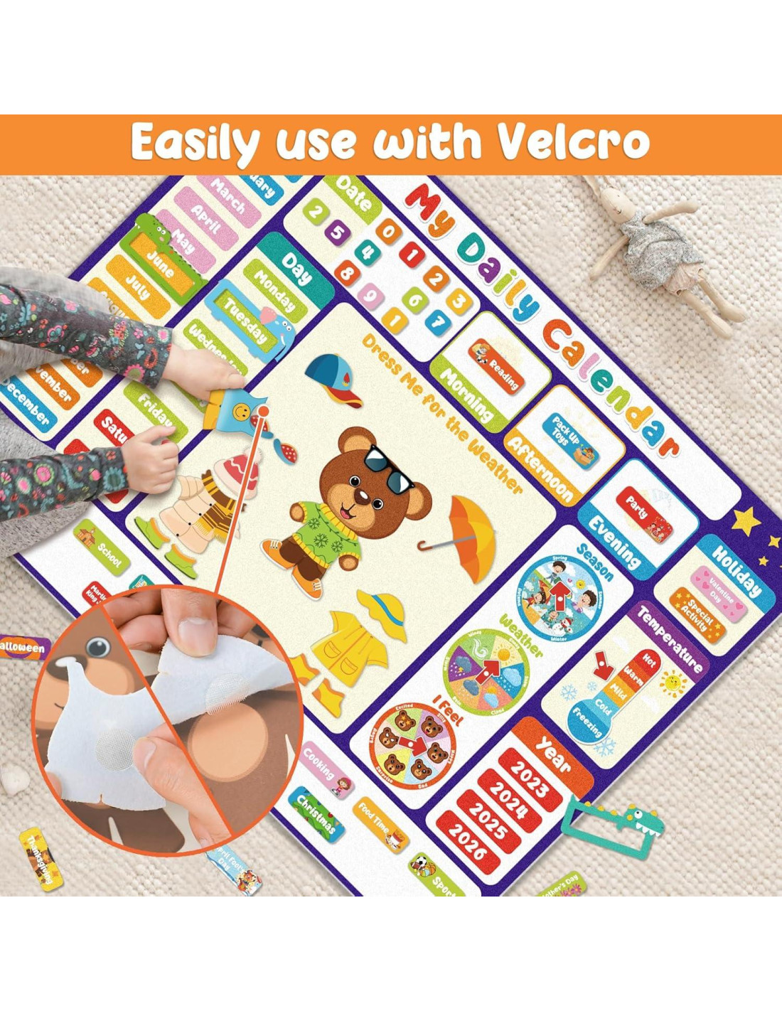 - Juego de Calendario de Fieltro para Niños 2025: ¡Haz que la educación infantil sea divertida e interactiva con nuestro Tablero de Fieltro Mi Calendario Diario! Diseñado para ayudar a los niños pequeños a aprender los días de la semana, meses, años, clima, estaciones, emociones y más, este conjunto de calendario fomenta el aprendizaje práctico y la creatividad. Características especiales como el oso "Vísteme" para ropa adecuada al clima y tarjetas de emociones ayudan a los niños a expresarse mientras desarrollan habilidades esenciales. ¡Perfecto para estimular la imaginación y el crecimiento cognitivo!