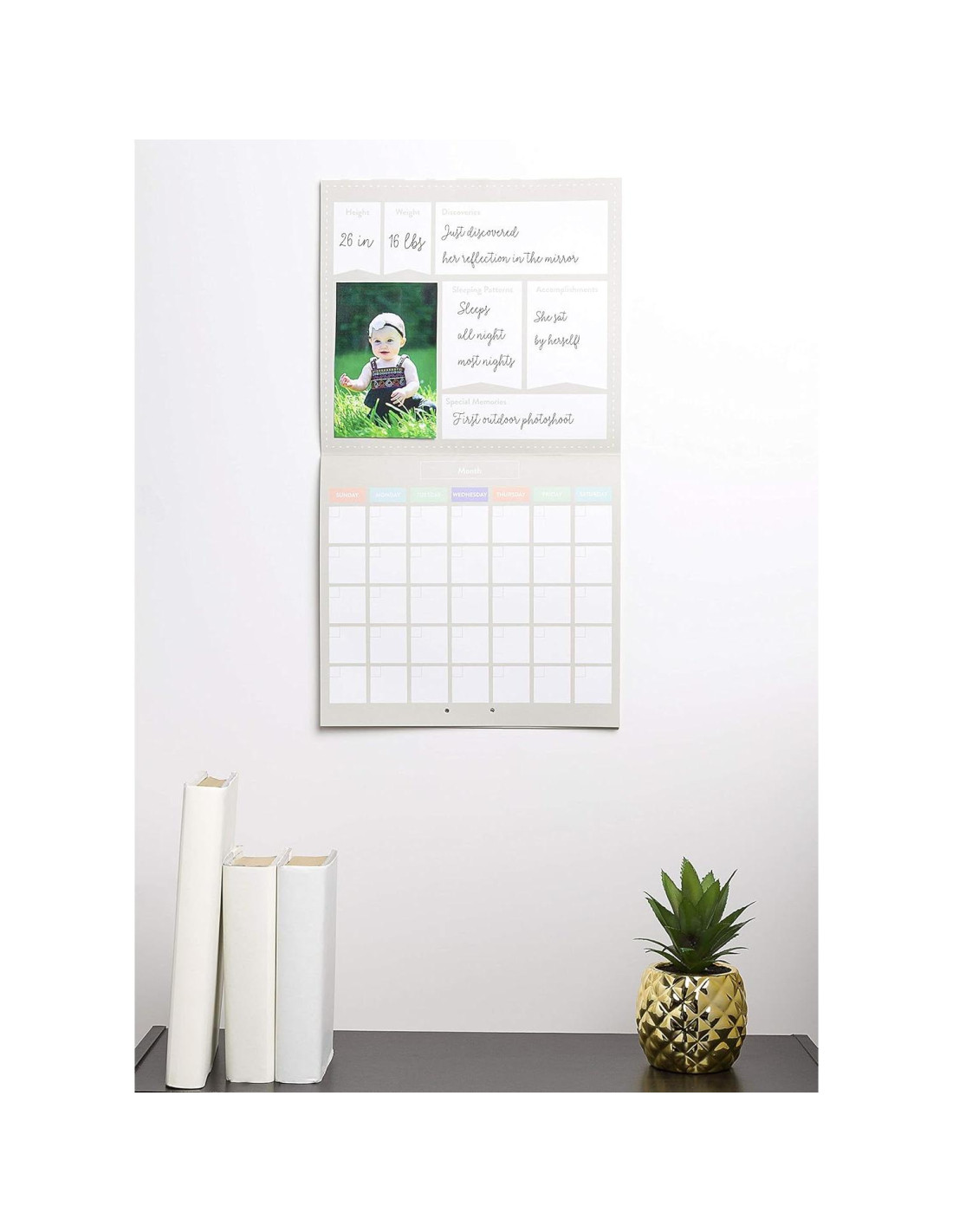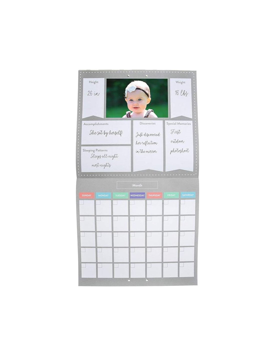 - El Calendario del Primer Año del Bebé de Pearhead es la manera perfecta de celebrar el primer año de vida de tu pequeño; una vez que el año haya terminado, guarda el calendario como un recuerdo para mirar hacia atrás durante años.