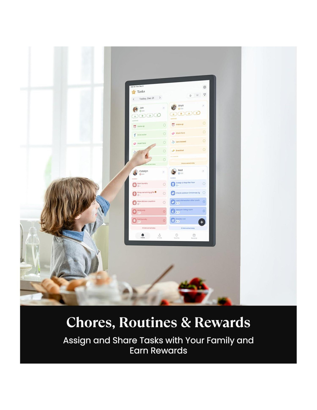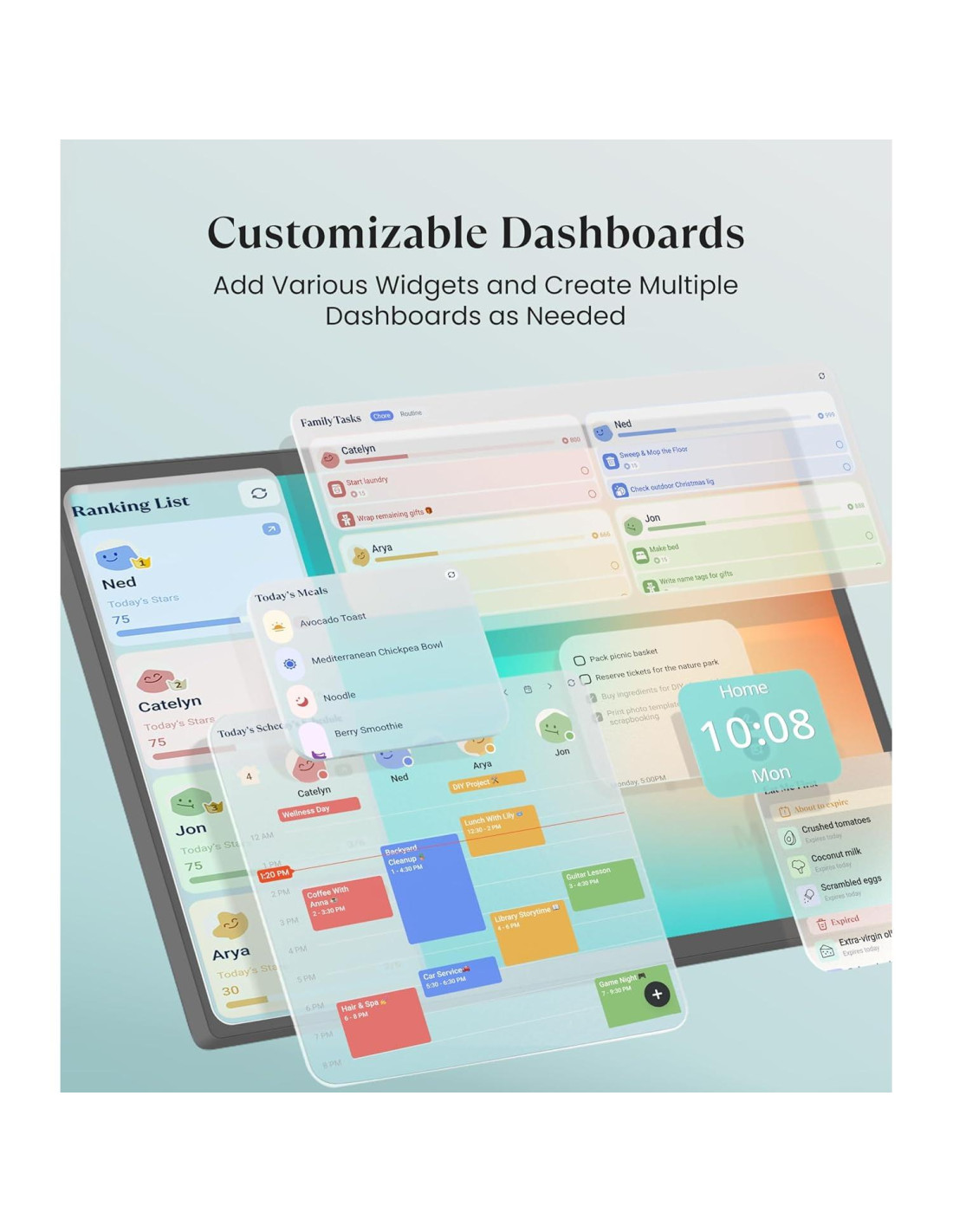 - Tablero Personalizable: Descarga fácilmente cualquier aplicación de la Google Play Store y crea un tablero personalizado. Arrastra y suelta widgets como un calendario, gráfico de tareas, planificador de comidas, lista de tareas, reproductor de medios y actualizaciones del clima para adaptar este calendario electrónico de pared a las necesidades de tu familia.
