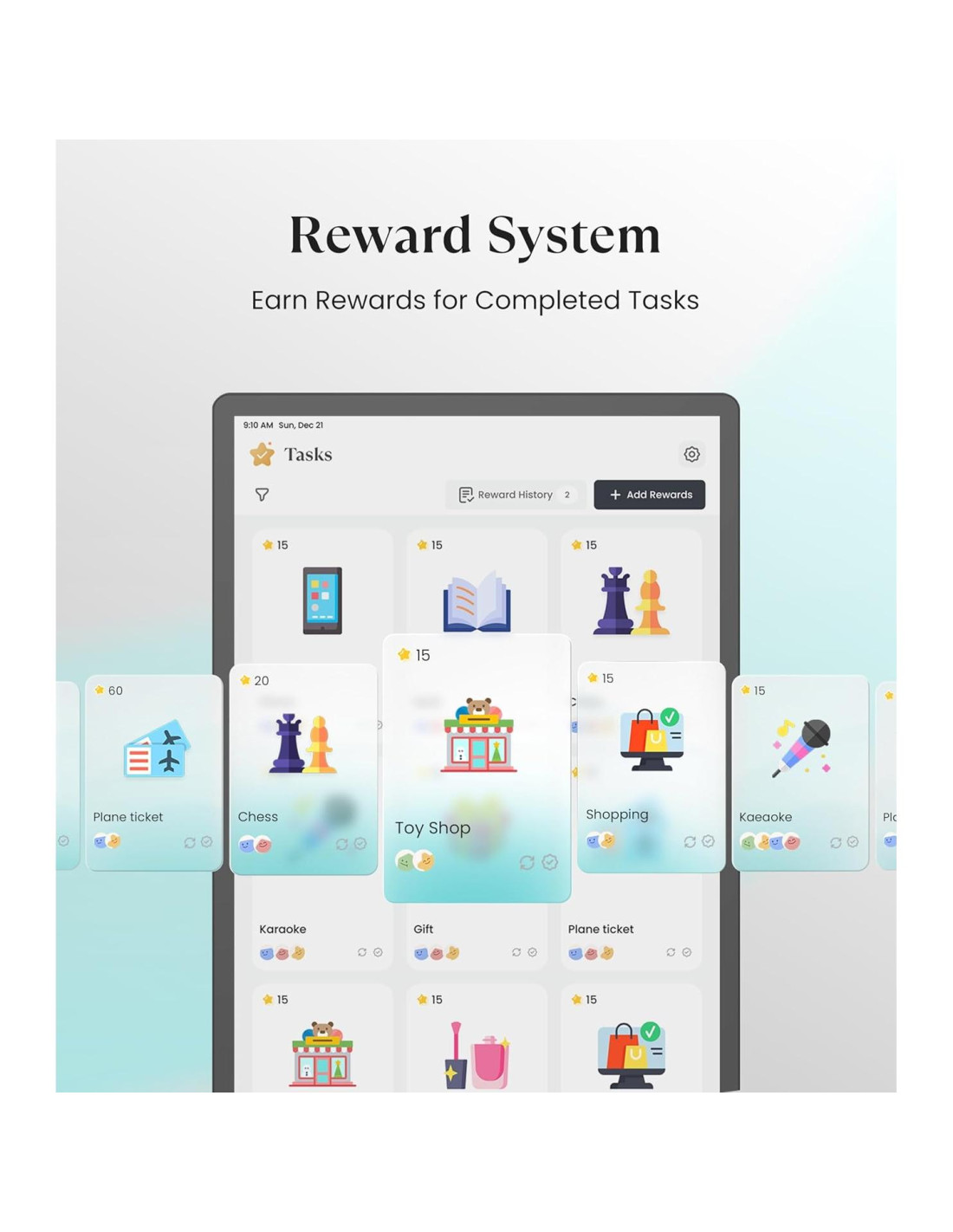- Gráfico de Tareas Digital y Sistema de Recompensas: El calendario eléctrico asigna tareas a cada miembro de la familia con una divertida y fácil de usar aplicación de gráfico de tareas familiares. Cada uno recibe un color único y puede personalizar su propio avatar para una experiencia personalizada. Los miembros de la familia ganan puntos al completar gráficos de tareas, haciendo que las responsabilidades sean tanto gratificantes como motivadoras.