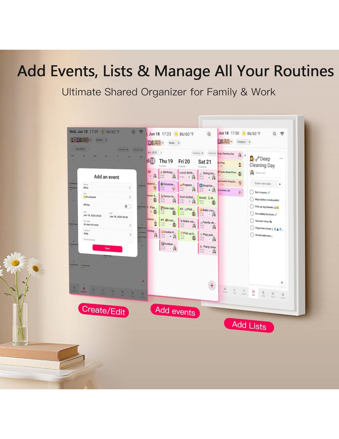- [Montaje Flexible para Todos los Miembros de la Familia] Monta fácilmente el calendario inteligente en la pared o colócalo en cualquier superficie plana usando el soporte incluido, perfecto para cocinas, pasillos u oficinas en casa. Diseñado pensando en todas las edades, es accesible para miembros de la familia mayores y niños por igual. Un regalo reflexivo y práctico para tu familia o seres queridos. Incluye un calendario digital de 15.6", soporte de escritorio, soporte de pared, adaptador de corriente de 12V/4A y guía de instalación.