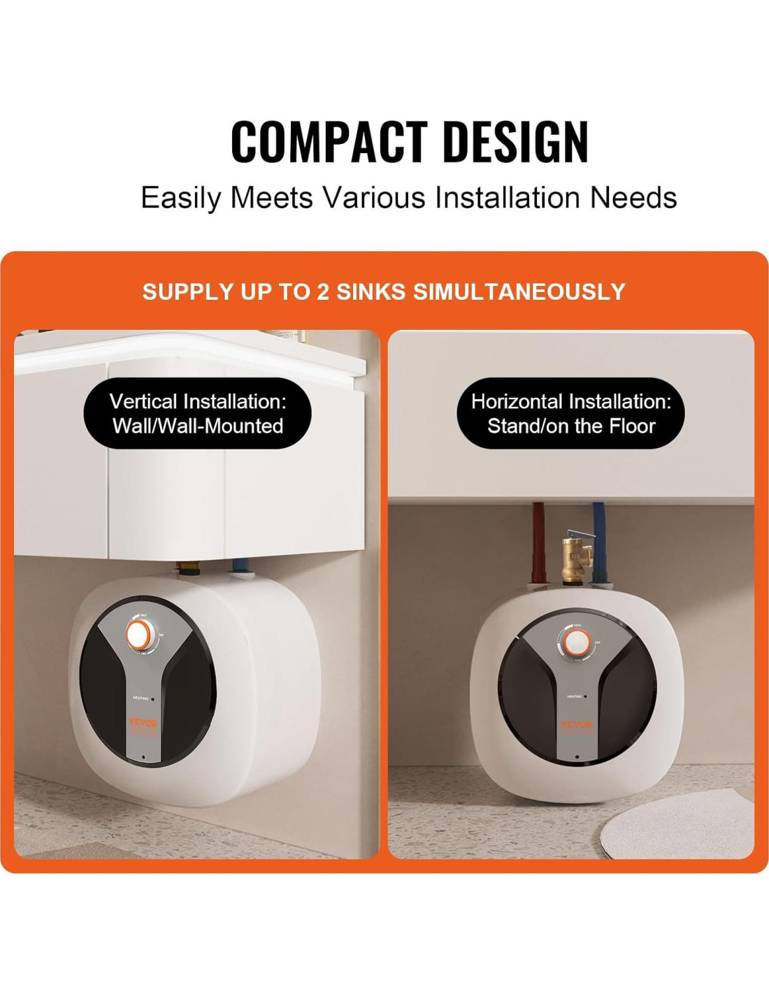 - 2 Métodos de Instalación: Compacto y fácil de instalar: Su diseño pequeño y ligero ahorra espacio. Ofrecemos dos métodos de instalación, vertical y horizontal, y puede suministrar simultáneamente a dos fregaderos. Simplemente sigue las instrucciones de instalación paso a paso, y puedes instalar el calentador de agua en un estante, pared o suelo (con la entrada y salida hacia arriba).