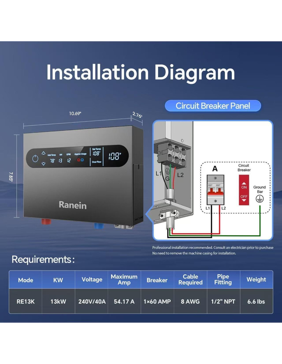 - Agua Caliente Infinita: Calentador de agua eléctrico sin tanque Ranein de 13kW con un caudal de hasta 11.6 LPM, puede proporcionar agua para 1-2 puntos de agua mientras asegura una experiencia de ducha cómoda.