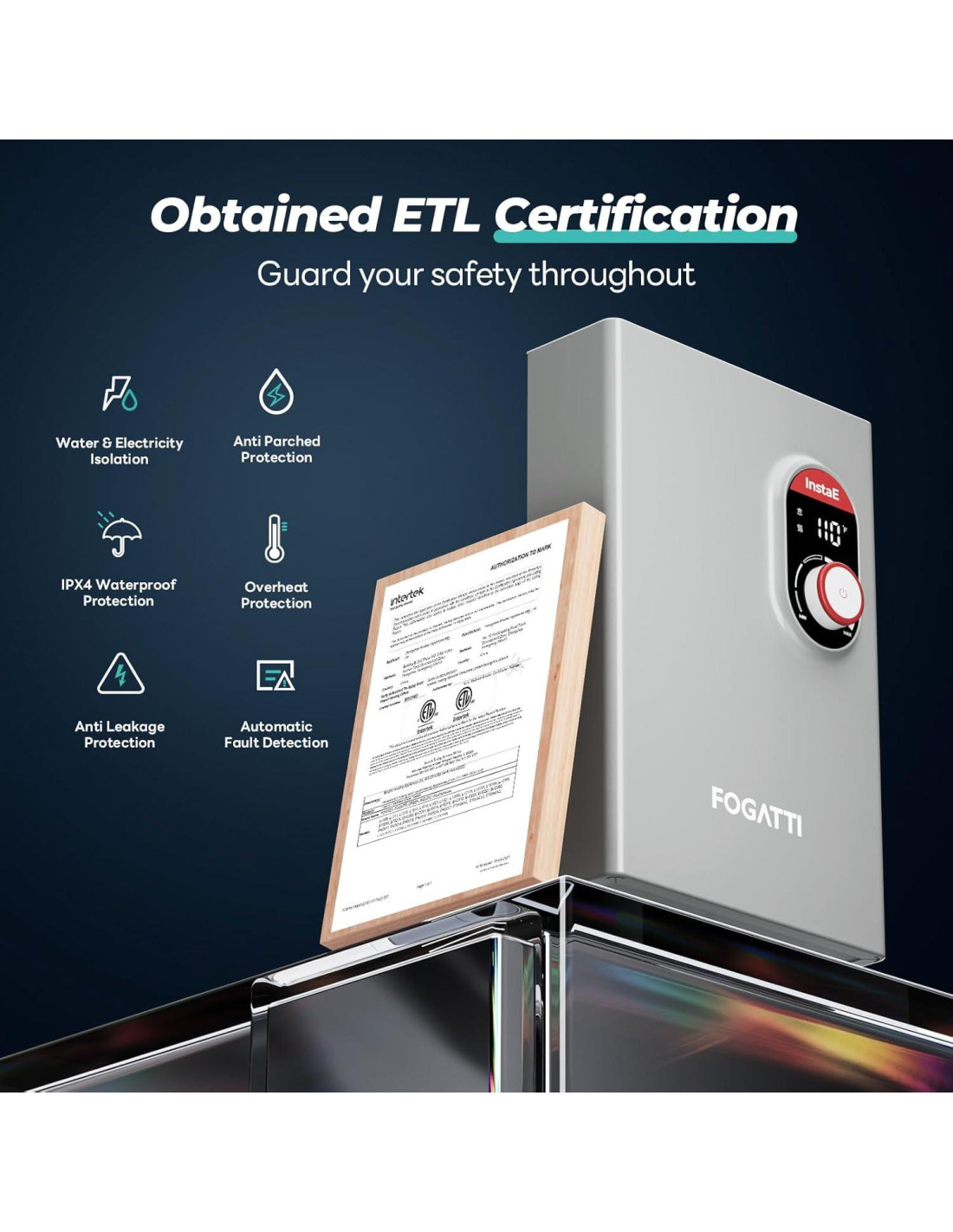 - Seguro y Confiable: La seguridad de los electrodomésticos de alta tensión debe someterse a pruebas rigurosas y certificación. FOGATTI ha pasado por una completa certificación de seguridad en ETL. Los elementos calefactores están aislados del agua para prevenir la acumulación de minerales y asegurar un rendimiento duradero.