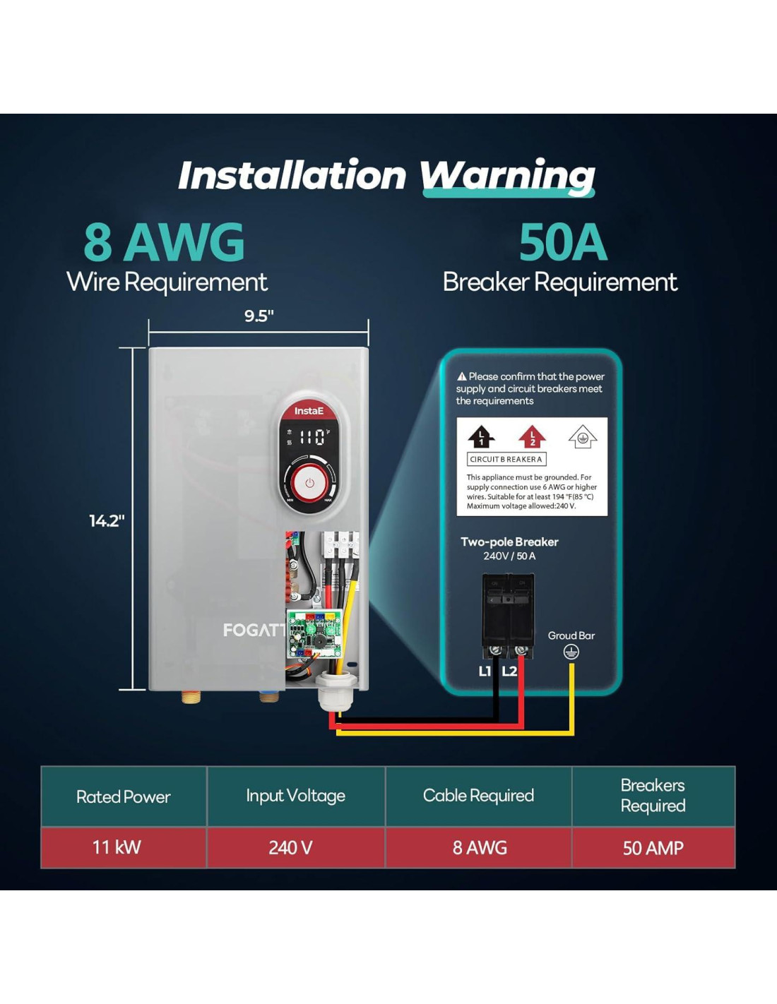 - NOTA: Asegúrese de entender primero los requisitos de uso del cable. El calentador de agua eléctrico sin tanque Fogatti 11kW 240V consume un máximo de 46Amperios; requiere 1 x 50 AMP Tamaño de Interruptor de Circuito y 1 x (8AWG/2) cables. Tamaño de la unidad 36.3 cm x 24.4 cm x 8.9 cm; Conexión de agua 1/2" NPT.