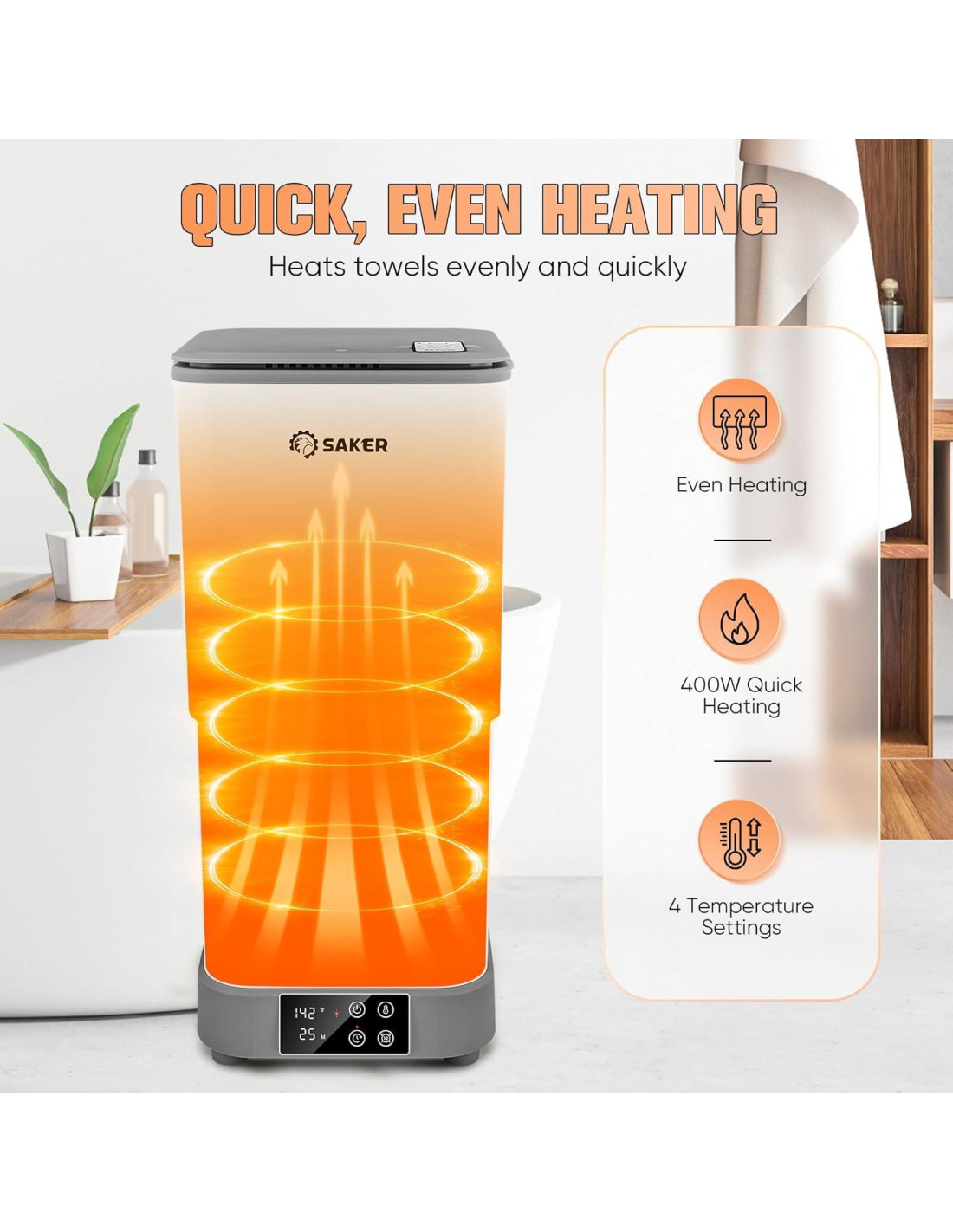 Saker puede ser la punta del iceberg entre muchas marcas de herramientas, pero el personal de Saker es apasionado por esta marca, dedicado a cultivar esta marca en un logo familiar en la industria de herramientas estadounidense. Saker cree que puede brindar tanta conveniencia y disfrute como sea posible a cada familia estadounidense. Hacemos nuestro mejor esfuerzo para convertir los problemas y peligros del trabajo industrial en una impresión popular en alta eficiencia y seguridad en el sentido moderno. Calentador de Toallas Saker de 30L, 400W de Calentamiento Más Rápido, con 4 configuraciones de temperatura, 4 configuraciones de tiempo, 1-12h de Cita. Con 4 opciones de temperatura, se adapta mejor a tus necesidades personales. Selección de tiempo de calentamiento y función de reserva para mantenerte caliente en todo momento. 30L, más grande y mejor. Satisface más necesidades. Diseño retráctil, más fácil de almacenar y colocar. Haz clic y configura, Pantalla LED, también soporta control remoto. Limitado a 60 grados, ¡rango efectivo dentro de 3 metros!