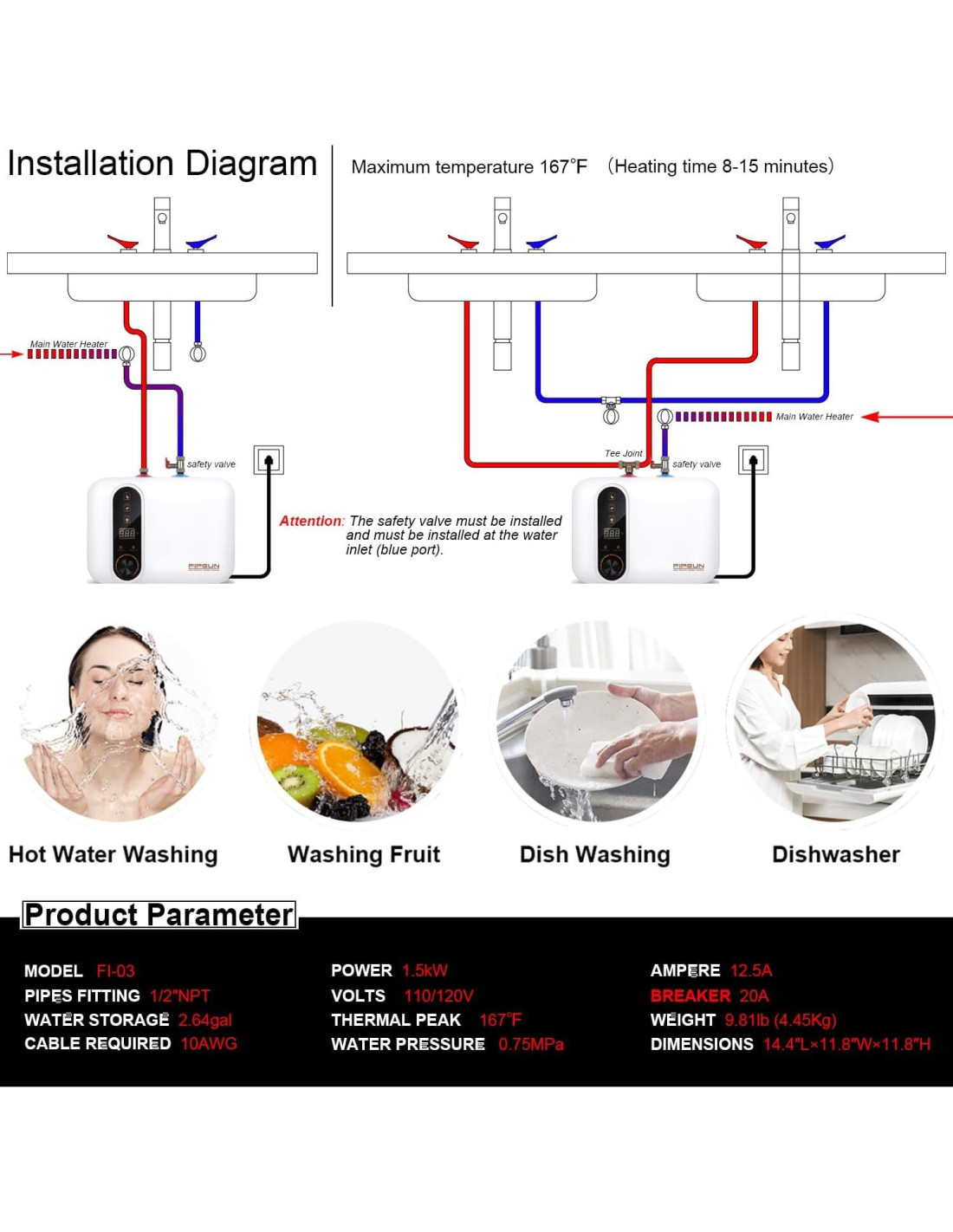 - [Escenarios Adecuados] Adecuado para instalación en lugares lejanos de fuentes de agua caliente y que no pueden obtener agua caliente a tiempo. Bajo el fregadero y encimera o barbería.