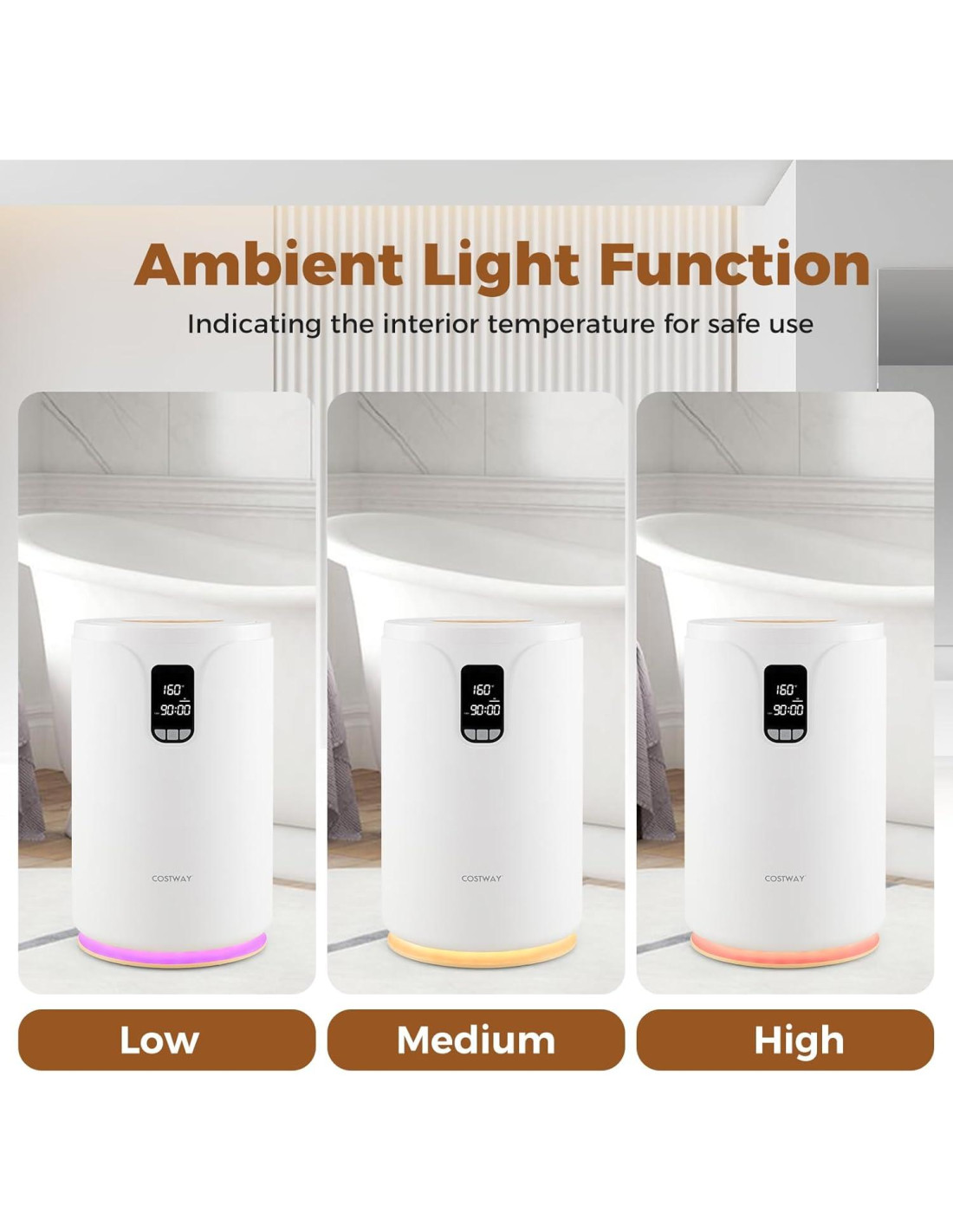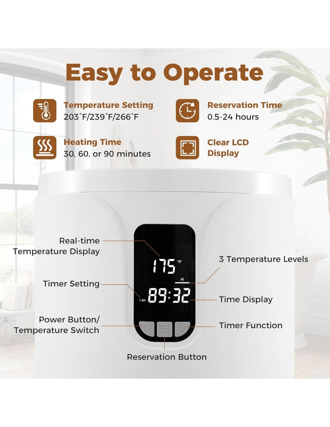 - Diseño Amigable para el Usuario: La pantalla LCD clara del cubo de toallas calientes te mantiene informado con la temperatura en tiempo real y el tiempo restante. Y con botones intuitivos, puedes establecer sin esfuerzo tu temperatura deseada entre 3 niveles de temperatura, elegir entre períodos de calentamiento de 30/60/90 min y ajustar el temporizador de retraso entre 0.5 a 24 horas para adaptarse a tu horario.