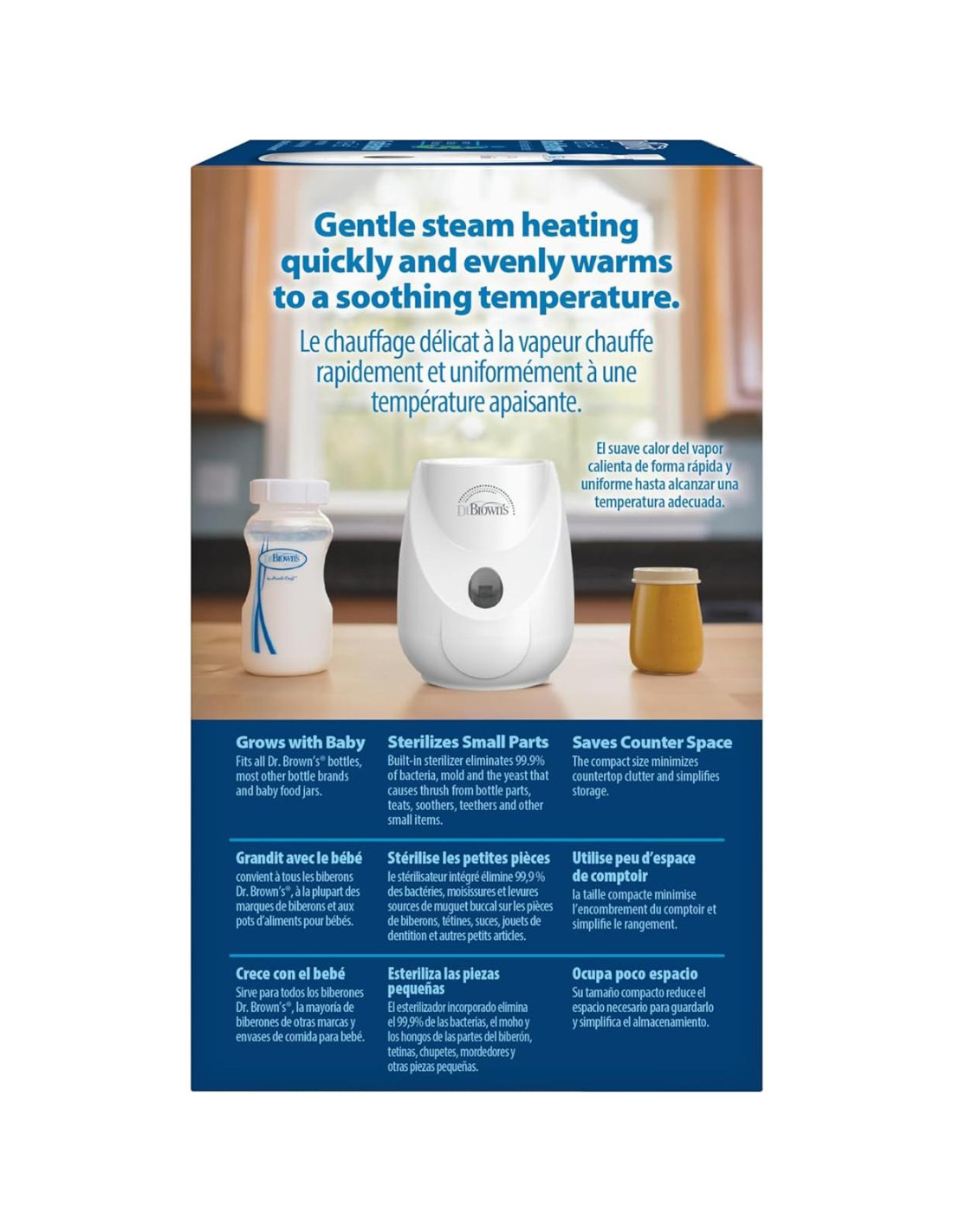 - CRECE CON EL BEBÉ. El calentador de biberones utiliza calor suave de vapor para calentar rápida y uniformemente el contenido con solo presionar un botón. Se adapta a todos los biberones Dr. Brown's, la mayoría de otras marcas de biberones y tarros de comida para bebés.