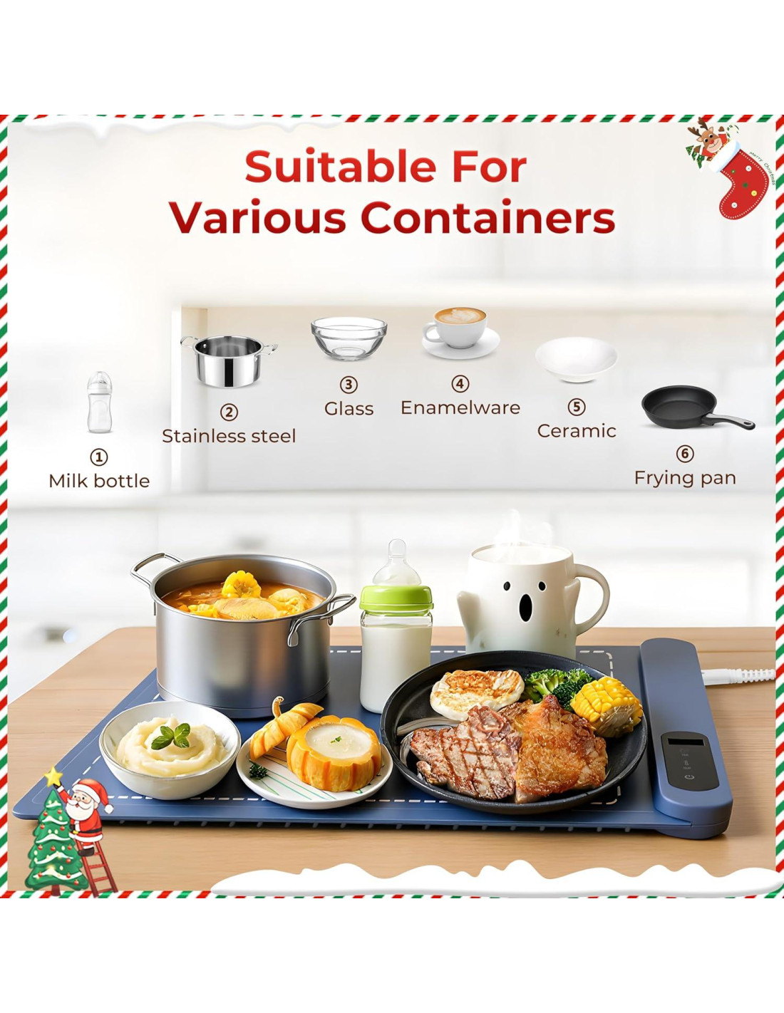 - [Calor y Temporizador Personalizables] Las funciones de temperatura y temporizador ajustables te dan un control preciso para combinar diferentes alimentos y ocasiones. La alfombrilla calentadora tiene 6 niveles de temperatura (50-100 grados Celsius), 1-6 horas de temporizador para mantener caliente, y se apagará automáticamente por protección si no se usa durante más de 6 horas.