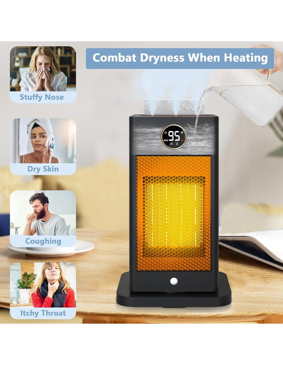 - Calentador de Espacio con Humidificador: Experimenta calidez sin sequedad con nuestro calentador de espacio, equipado con la última tecnología de humidificación segura. Simplemente llena el agua en el calentador, presiona el botón de humidificador y disfruta de los beneficios duales de calefacción y humidificación. Nuestro calentador de espacio interior prioriza la seguridad con tanques de agua separados, lo que garantiza un estándar de seguridad absoluto, creando un ambiente cómodo en tu espacio vital.
