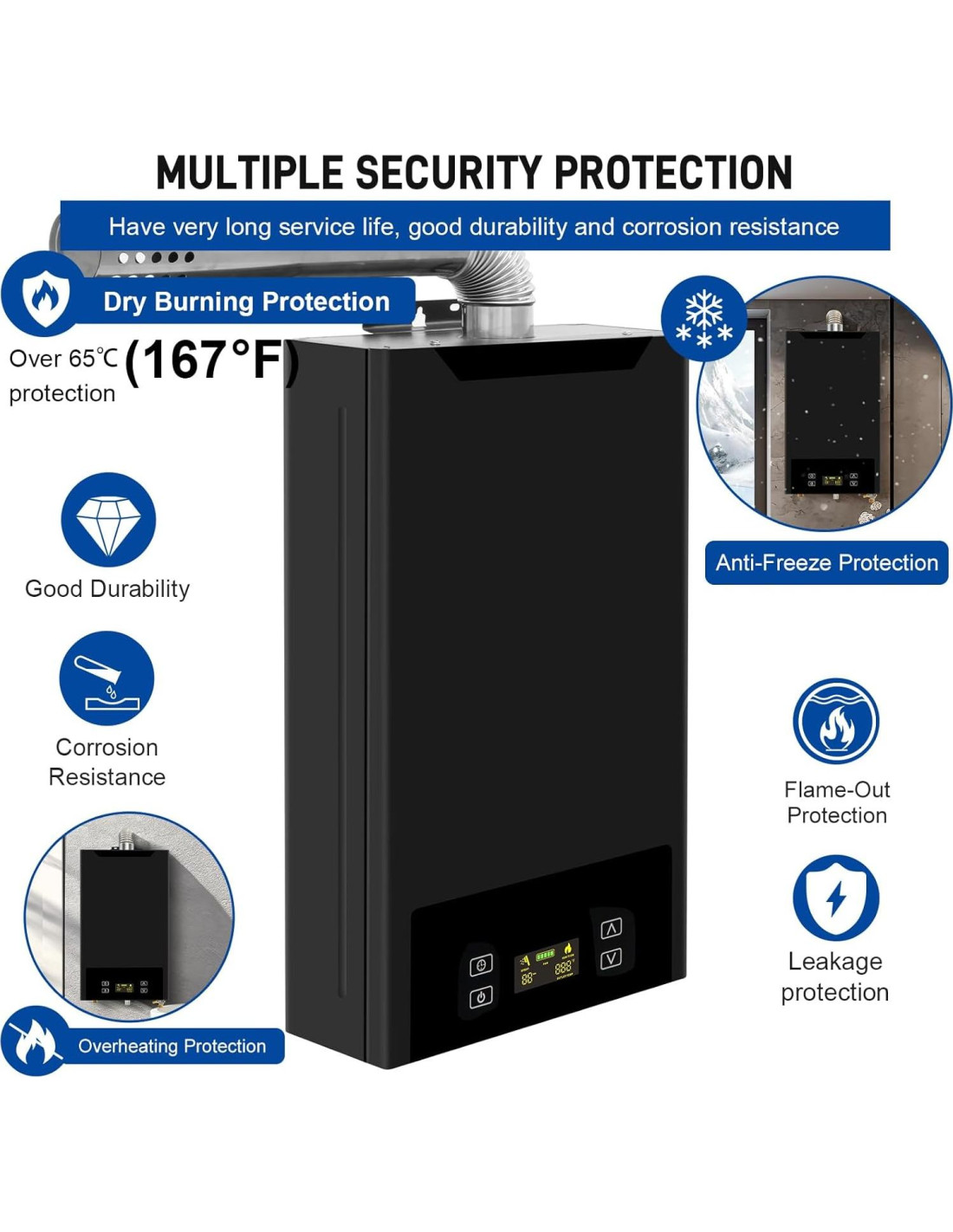 - [Material de Calidad] - Este calentador de agua está fabricado en acero inoxidable, nuestro calentador de agua a propano exhibe alta resistencia a la temperatura y resistencia a la corrosión. También cuenta con un tanque de agua de cobre sin oxígeno incorporado, reduce la pérdida de calor asegurando una vida útil prolongada. Con pantalla digital LED inteligente que ajusta sin esfuerzo la temperatura entre 86F (30C) y 167F (75C) según tus preferencias.