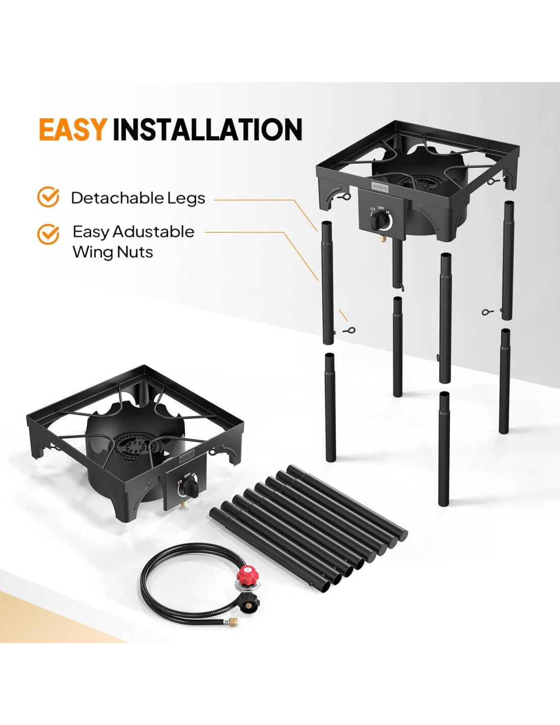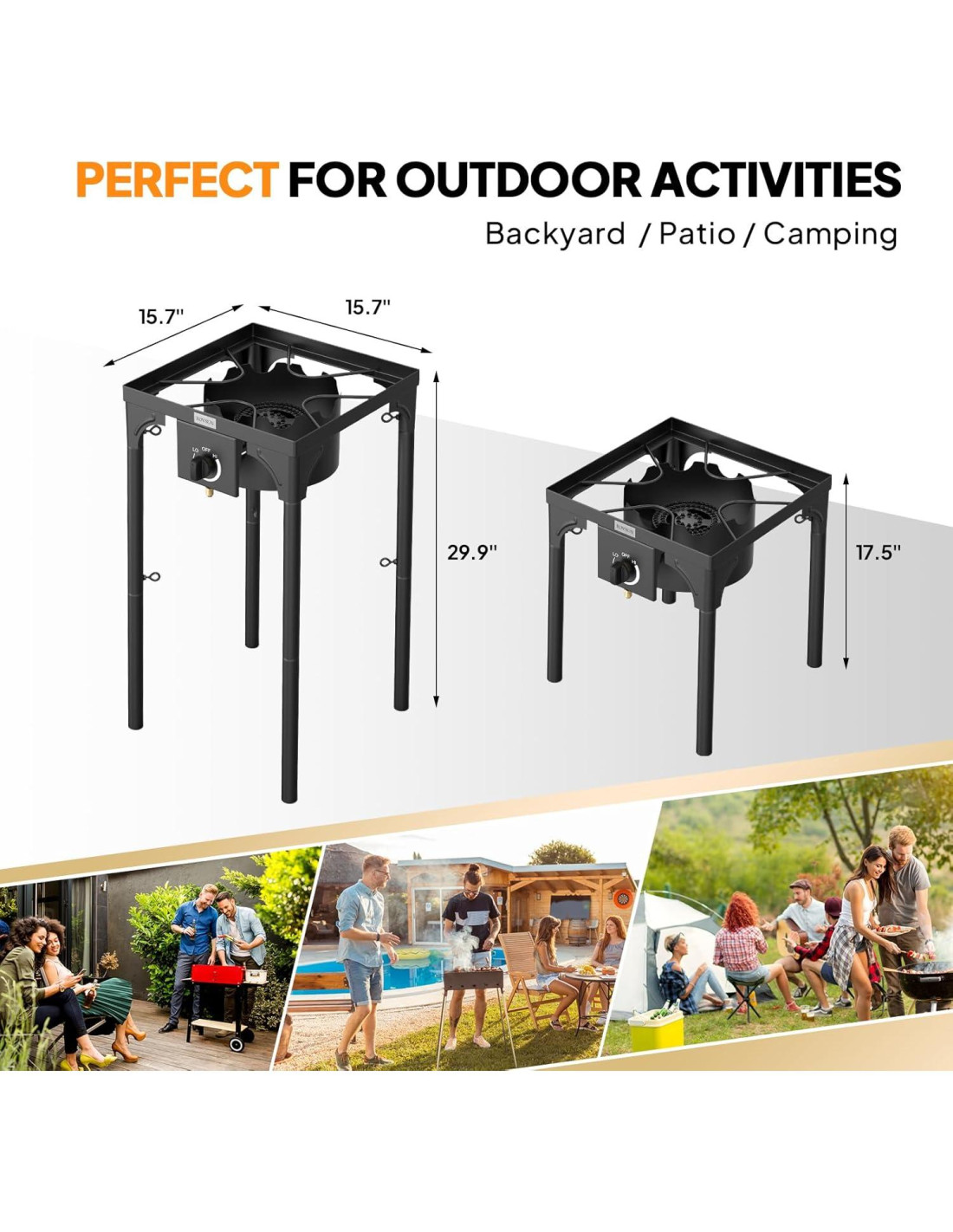 - 100,000BTU La estufa emite una llama fuerte que se puede ajustar fácilmente. El calor se controla mediante un regulador aprobado por CSA, que es más seguro y tiene un tiempo de trabajo más prolongado.