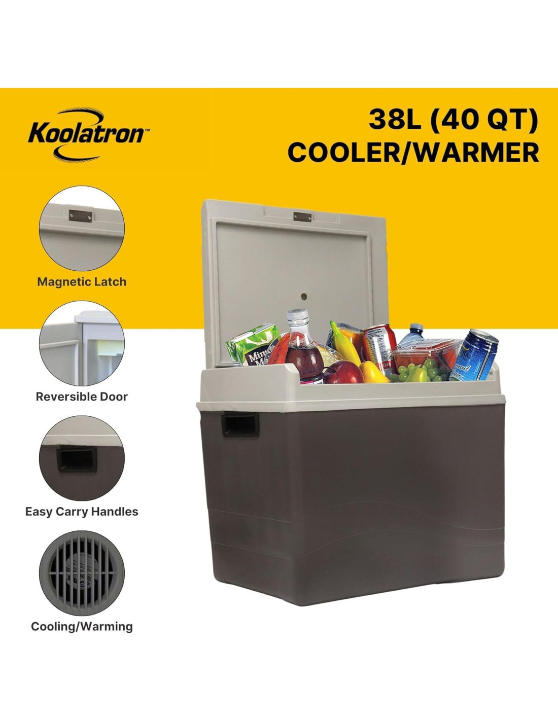 La conveniencia de la refrigeración sin hielo, especialmente diseñada para espacios reducidos. La eficiente tecnología termoeléctrica hace que el Koolatron sea el enfriador perfecto para días de salida con la familia. Conéctalo a la salida de 12V de tu vehículo para mantener los artículos fríos a 40F (22C) por debajo de la temperatura ambiente o calientes a 140F (60C), utilizando menos energía que la luz trasera de tu vehículo. Almacenamiento compacto y seguro de alimentos y bebidas. Con el enfriador portátil puedes mantener fácilmente frías las bebidas favoritas de tu familia o transportar de manera segura artículos perecederos como yogur, queso, leche y carnes, y el adaptador de CA opcional (se vende por separado) te permite hacer la transición sin problemas del poder de enfriamiento al interior. El exterior duradero de plástico moldeado por inyección protege el contenido y asegura un rendimiento óptimo. La avanzada tecnología termoeléctrica ofrece funciones de enfriamiento o calentamiento en una unidad y no se verá afectada por el movimiento de tu vehículo, haciendo de este enfriador la elección perfecta para excursiones de un día.