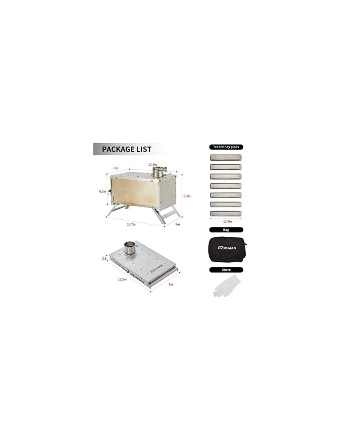 - Estufa de Madera de Camping Portátil para Tienda: Incluye 1 cuerpo de estufa, 7 secciones de tubos de chimenea de 12.4 pulgadas (31.5 cm) de diámetro, 1 par de guantes, la estufa XCMAN es una estufa de madera diseñada para viajar.