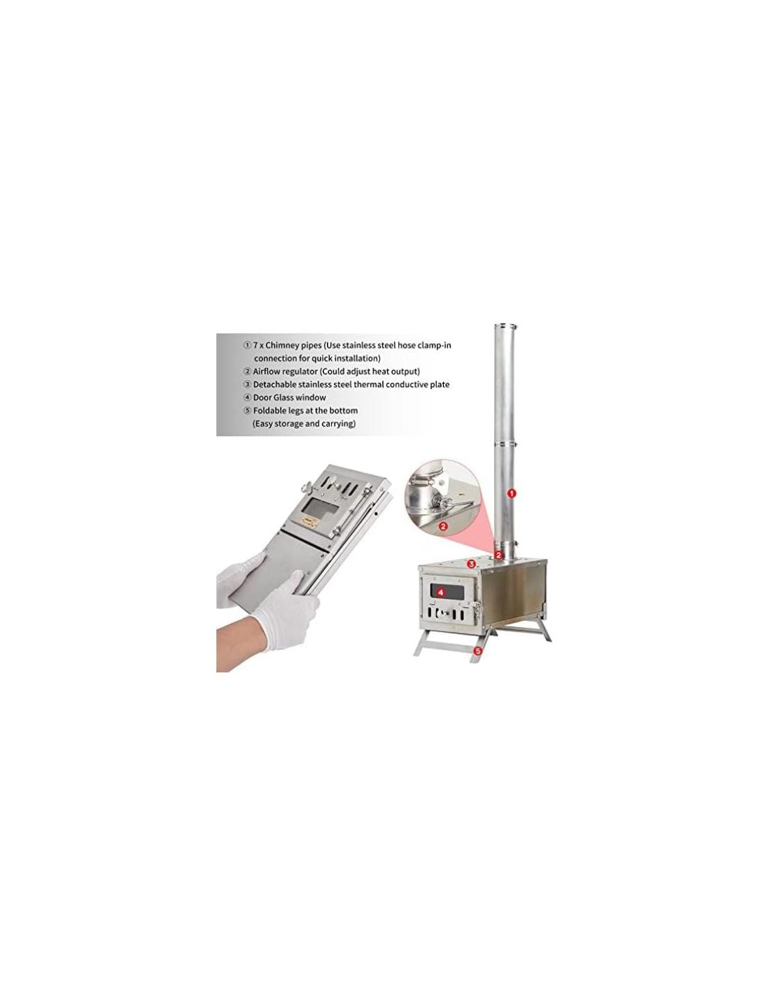- Estufa de Tienda de Camping: Esta estufa exterior está disponible para la tienda con un conducto de chimenea. Es ideal para calentar y cocinar en una tienda. Equipado con seis secciones de tubo de chimenea entrelazadas. Genial para camping, mochileo, pesca en hielo y viajes de caza